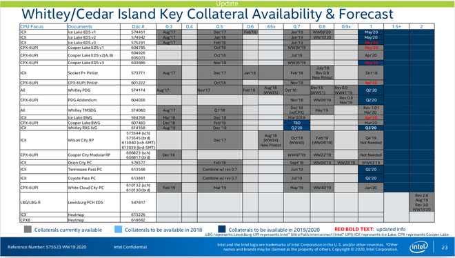 Một trong những điểm đáng chú ý khác của khối dữ liệu này là nó chứa tài liệu có tên "Whitley/Cedar Island Platform Message of the Weeks", có thời gian vào ngày 5 tháng Năm vừa qua. Cedar Island là kiến trúc bo mạch chủ nằm bên dưới các CPU Cooper Lake và Ice Lake Xeon. Trong khi đó Whitley là kiến trúc dual-socket dành cho cả dòng CPU Cooper Lake (14nm) và Ice Lake (10nm) XEON.