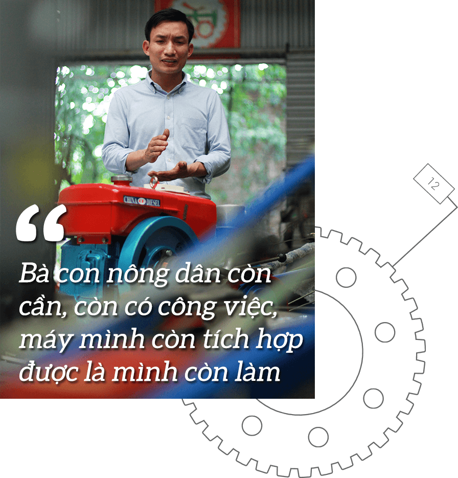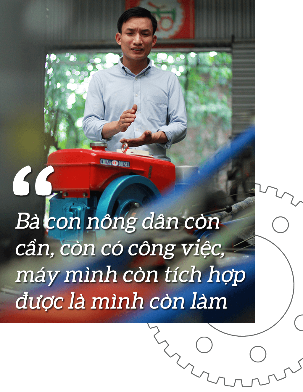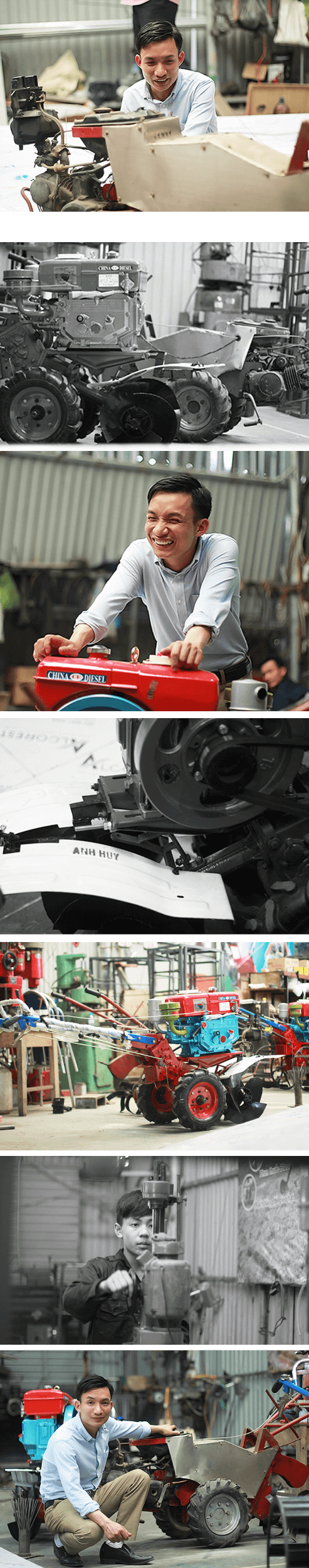 cũng đang sản xuất những loại máy đặc thù mà thị trường không có sẵn. Chẳng hạn như máy làm cỏ, vun xới trong phạm vi nhỏ hơn 25cm. Khi thực tiễn sản xuất của bà con cần loại máy nào, anh sẽ chế tạo ra loại máy đó để phục vụ. Trả lời câu hỏi về ý định nâng cấp tính năng cho chiếc máy của mình, Huy khẳng định, anh sẽ không dừng lại ở đây. Tuy nhiên, việc thêm tính năng hay không là do công việc của bà con nông dân.