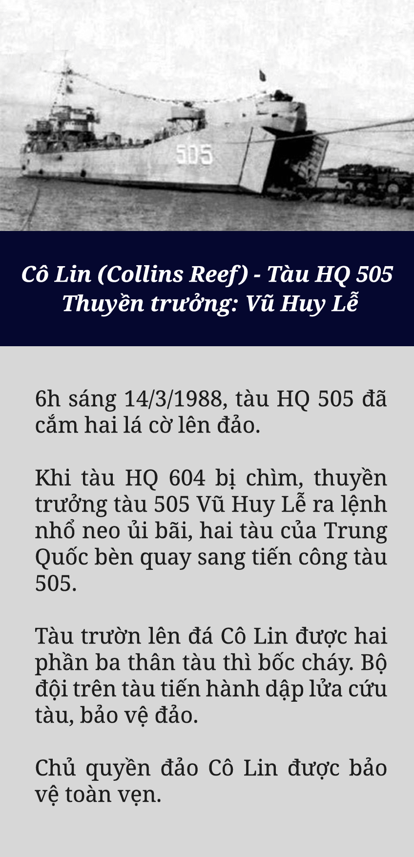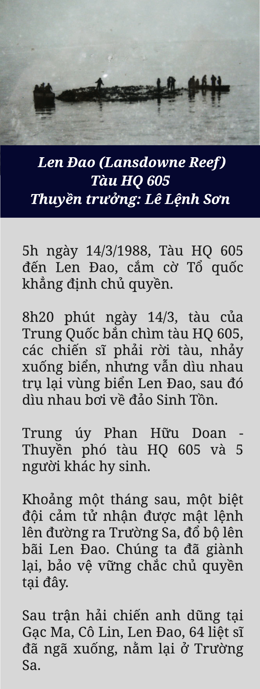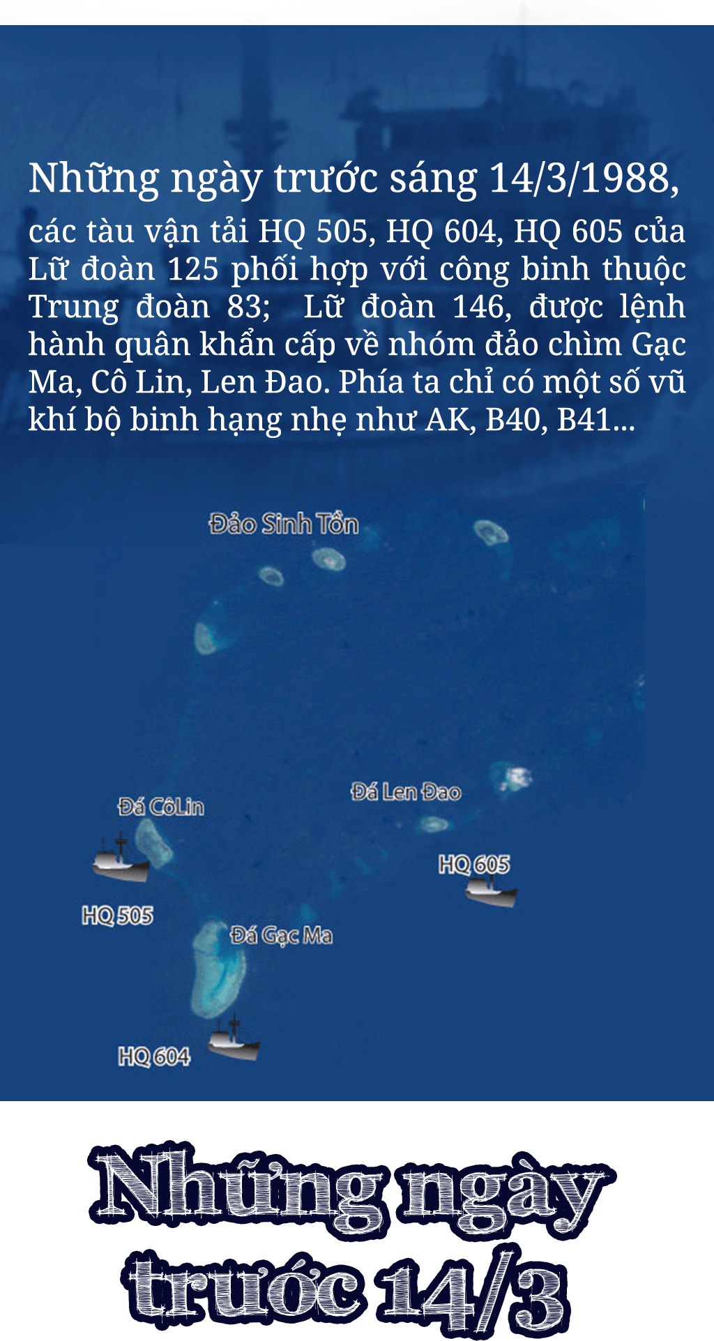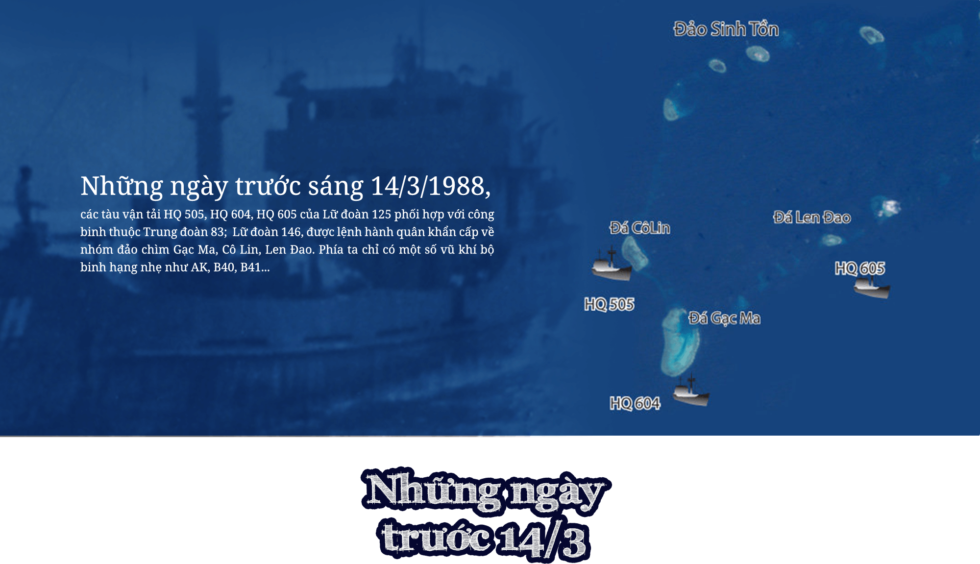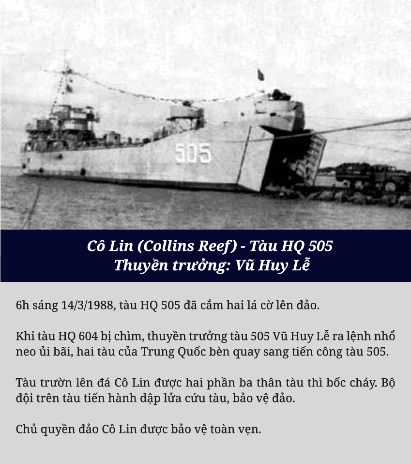 Ngày 12/3/1988, Tàu 605, xuất phát từ Đá Đông đến đóng giữ Len Đao. 9h, ngày 13/3/1988 , tàu HQ 604 và tàu HQ 505, xuất phát từ Đá Lớn tiến về Gạc Ma, Cô Lin.