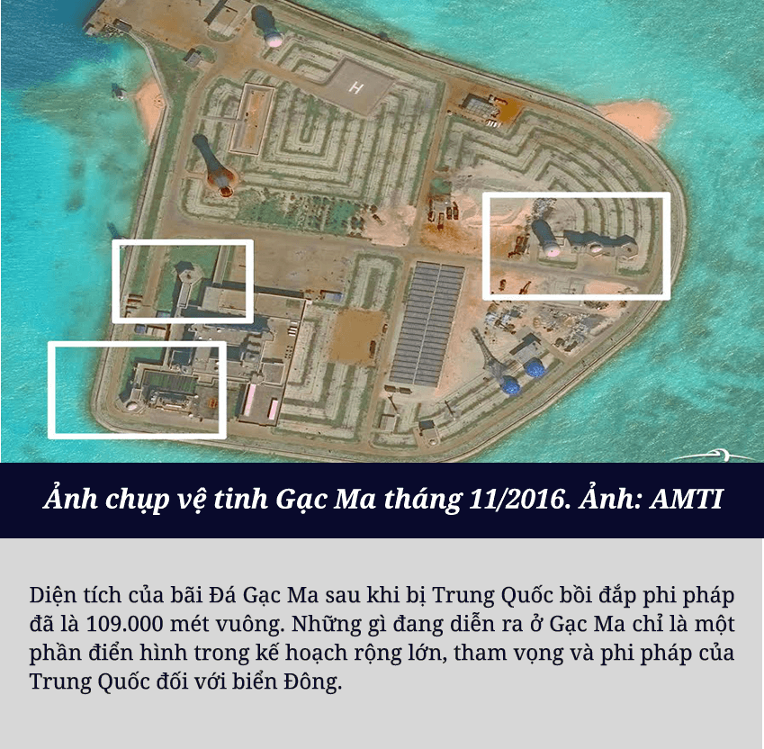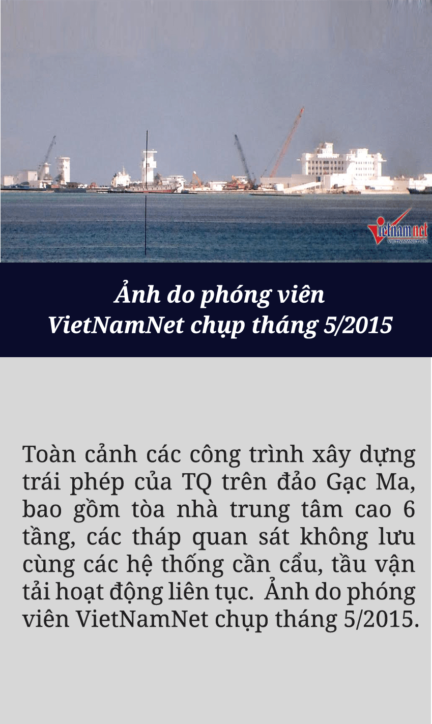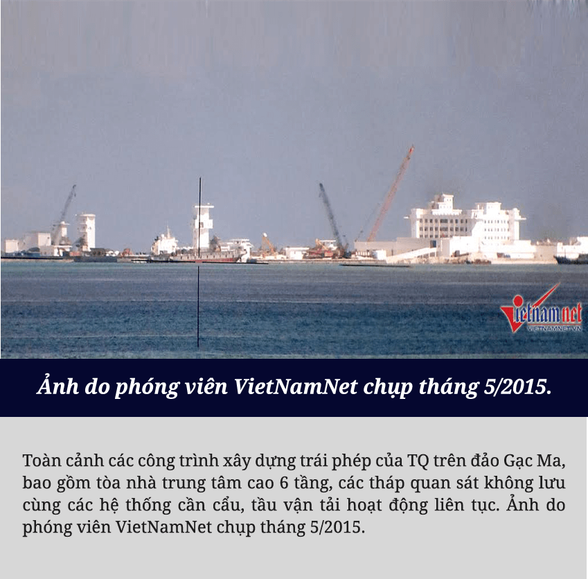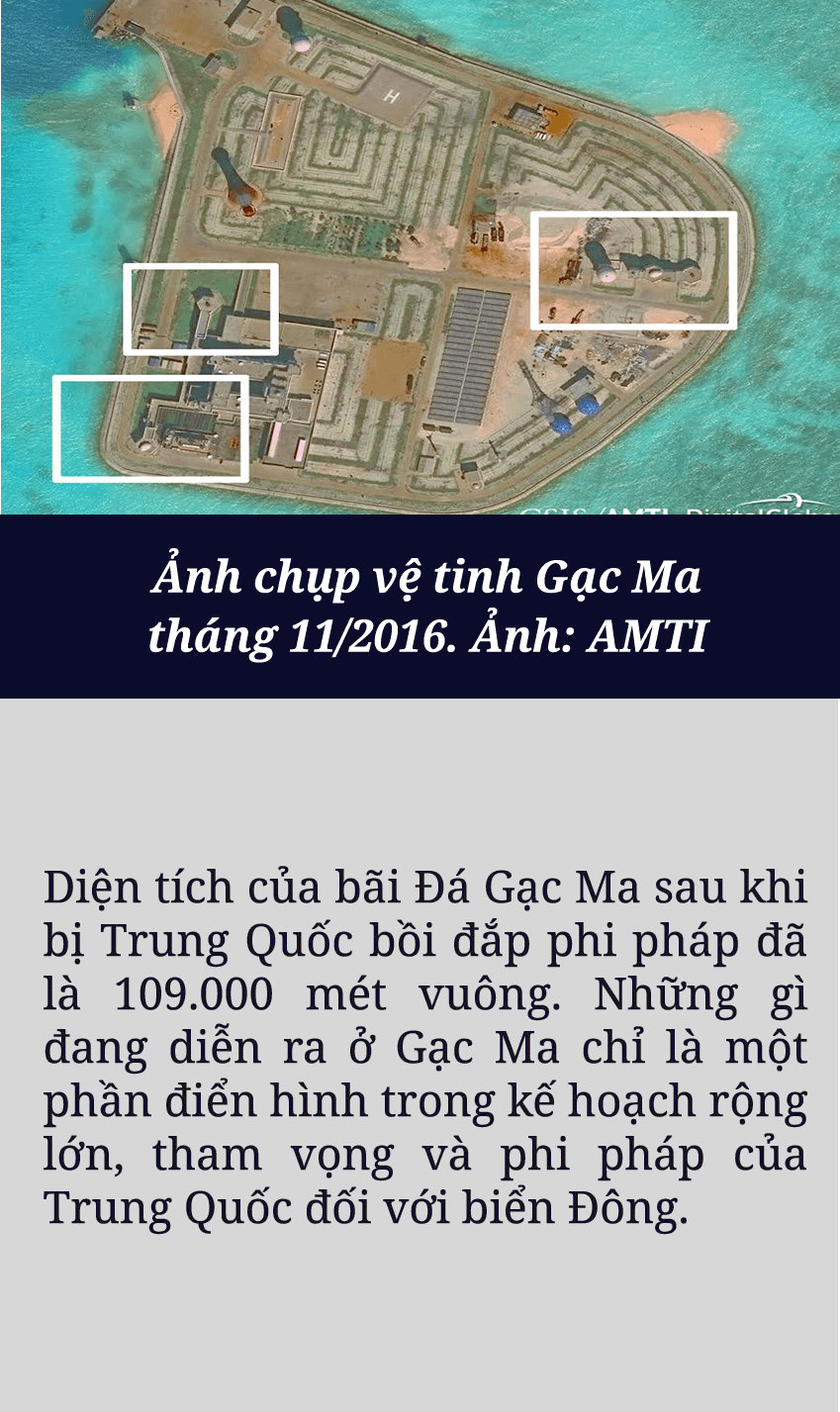 Sau khi sử dụng vũ lực chiếm đóng trái phép Gạc Ma từ năm 1988, Trung Quốc từng bước cải tạo, xây dựng trên bãi đá này những cấu trúc vững chắc, biến đây thành một trong những tiền đồn quân sự phi pháp của nước này trên Biển Đông. Mọi thứ lại một lần nữa thay đổi nhanh chóng kể từ cuối tháng 02/2014, khi quân đội Trung Quốc tiến hành các hoạt động cải tạo, mở rộng và lấn chiếm với quy mô lớn chưa từng có. Hàng chục máy xúc, máy ủi, cần cẩu với cả tá tàu bè lớn nhỏ ngày đêm bơm hút lượng cát khổng lồ lên Gạc Ma.
