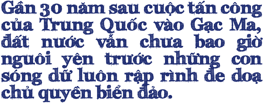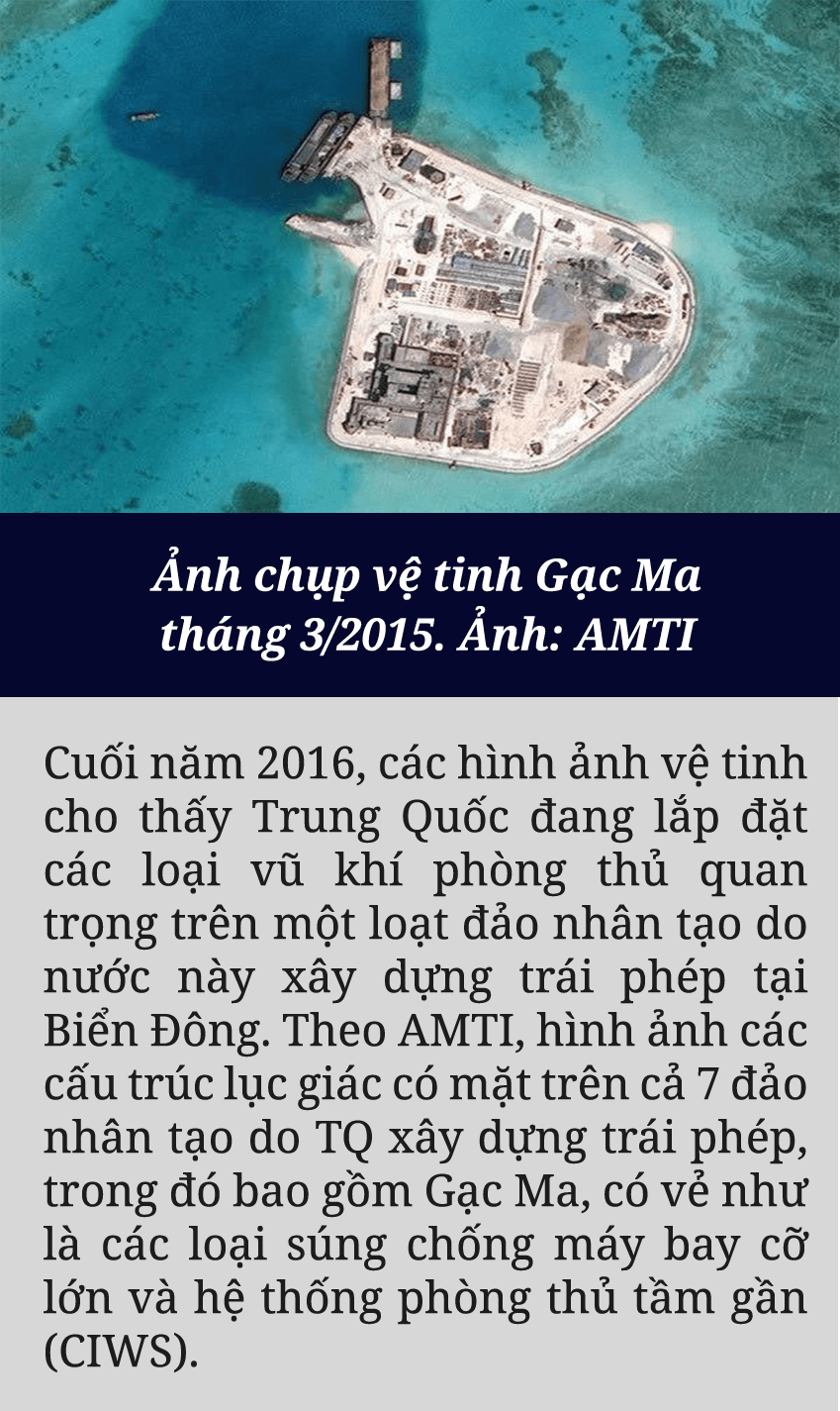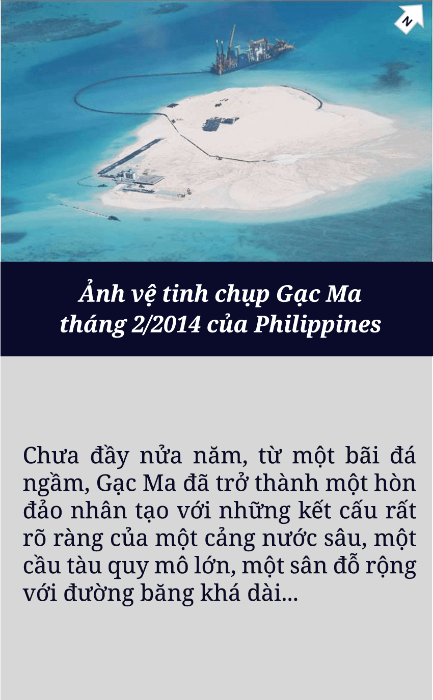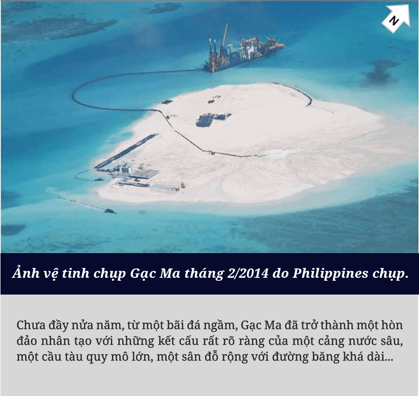 Sau khi sử dụng vũ lực chiếm đóng trái phép Gạc Ma từ năm 1988, Trung Quốc từng bước cải tạo, xây dựng trên bãi đá này những cấu trúc vững chắc, biến đây thành một trong những tiền đồn quân sự phi pháp của nước này trên Biển Đông. Mọi thứ lại một lần nữa thay đổi nhanh chóng kể từ cuối tháng 02/2014, khi quân đội Trung Quốc tiến hành các hoạt động cải tạo, mở rộng và lấn chiếm với quy mô lớn chưa từng có. Hàng chục máy xúc, máy ủi, cần cẩu với cả tá tàu bè lớn nhỏ ngày đêm bơm hút lượng cát khổng lồ lên Gạc Ma.