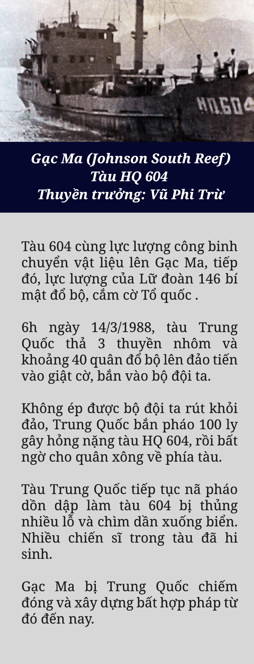Khoảng 3 giờ sáng ngày 14/3/1988, lực lượng của Trung đoàn Công binh 83 bắt đầu chuyển vật liệu từ tàu HQ-604 lên bãi Gạc Ma, lực lượng của Lữ đoàn 146 đã cắm được cờ lên bãi Gạc Ma. Rạng sáng 14/3/1988, các tàu chiến TQ áp sát. Đó là các biên đội tàu chiến thật sự với hỏa lực mạnh, trong khi các tàu VN chỉ là loại hải vận và đa số chiến sĩ trên tàu là công binh làm nhiệm vụ xây dựng đảo, không phải lính chiến đấu, trong tay chỉ có cuốc, xẻng, xà beng. Tại bãi Gạc Ma, thủy triều buổi sáng đã dâng cao hơn, nhưng nhóm bảo vệ ngọn cờ chủ quyền của thiếu úy Trần Văn Phương vẫn kiên cường trụ vững.