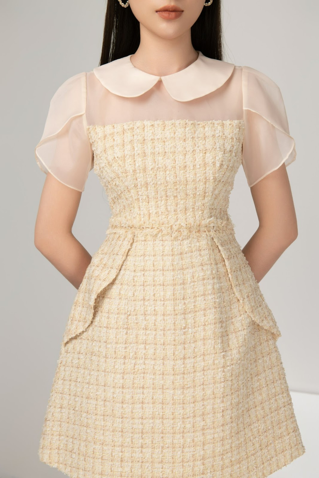 Vải dệt dạ tweed vừa sang trọng vừa giúp váy đứng phom, không bị nhăn, nhàu. Điểm nhấn của váy là phần cổ và tay nhẹ nhàng, yểu điệu với thiết kế voan tơ mềm mại. Trong những ngày thu lãng đãng, một chiếc váy dạ tweed gam màu be trang nhã chính là sự lựa chọn không thể hoàn hảo hơn để các nàng dạo phố.