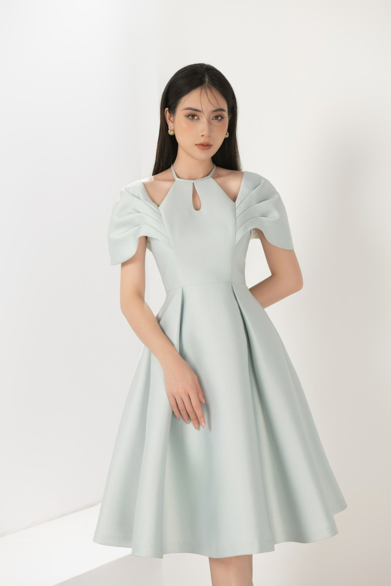 Trong bộ sưu tập váy đầm dự tiệc thu đông, váy dáng đầm xòe cổ yếm Keelin là một trong những mẫu nổi bật. Một mẫu váy không bị “đụng hàng” bởi thiết kế độc đáo. Chân váy xòe xếp ly nhẹ tạo dáng mềm mại và thướt tha. Tay thiết kế dập ly nhẹ nhàng cách điệu. Và điểm nhấn của váy là phần cổ yếm ấn tượng. Cổ yếm thiết kế cut-out khéo léo giúp khoe xương quai xanh một cách tinh tế. Đặc biệt, váy sở hữu màu xanh ngọc mát mắt.