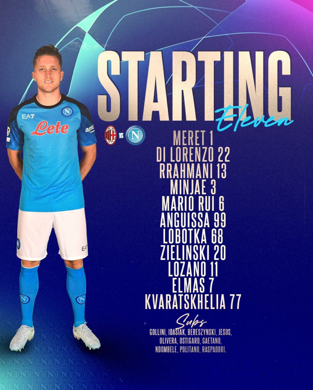 Napoli (4-3-3): Meret; Di Lorenzo, Kim, Rrahmani, Mario Rui; Lobotka, Anguissa, Zielinski; Lozano, Elmas, Kvaratskhelia.
