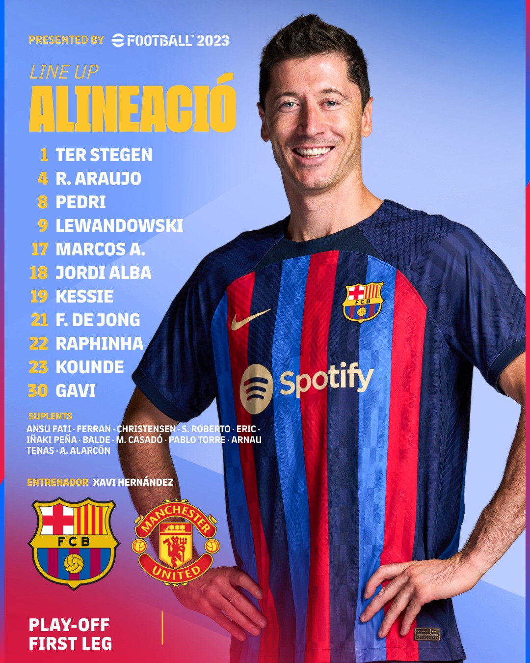 Barcelona: Ter Stegen; Kounde, Araujo, Alonso, Alba; Pedri, De Jong, Kessie; Raphinha, Lewandowski, Gavi.