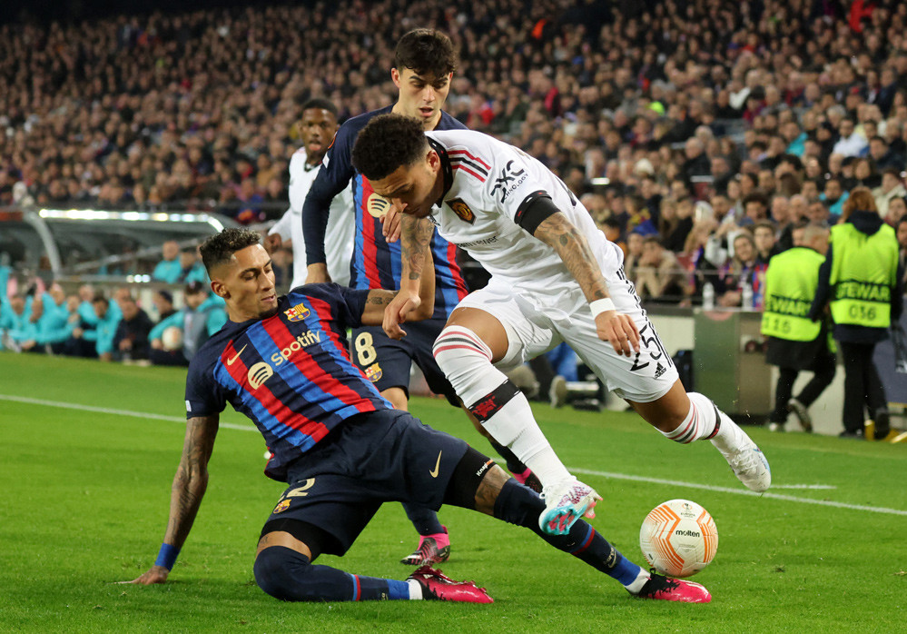 Rashford căng ngang từ biên trái cho Bruno rồi Malacia dứt điểm cận thành nhưng hậu vệ Barca cản phá kịp thời.