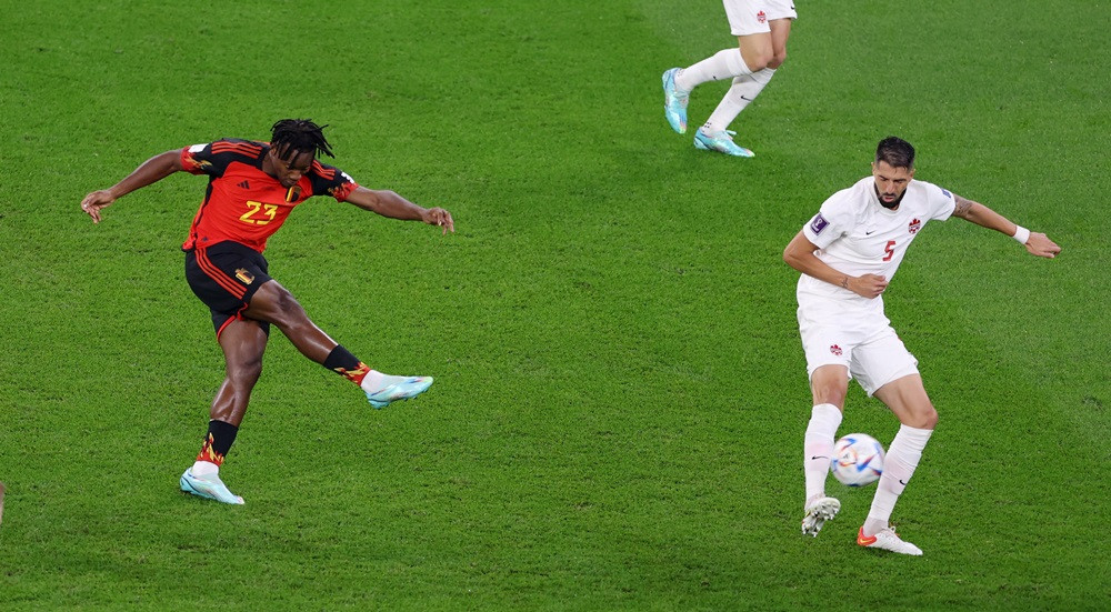 Canada uy hiếp khung thành tuyển Bỉ với pha đánh đầu của Stephen Eustaquio nhưng không gây ra khó khăn cho thủ thành Thibaut Courtois.