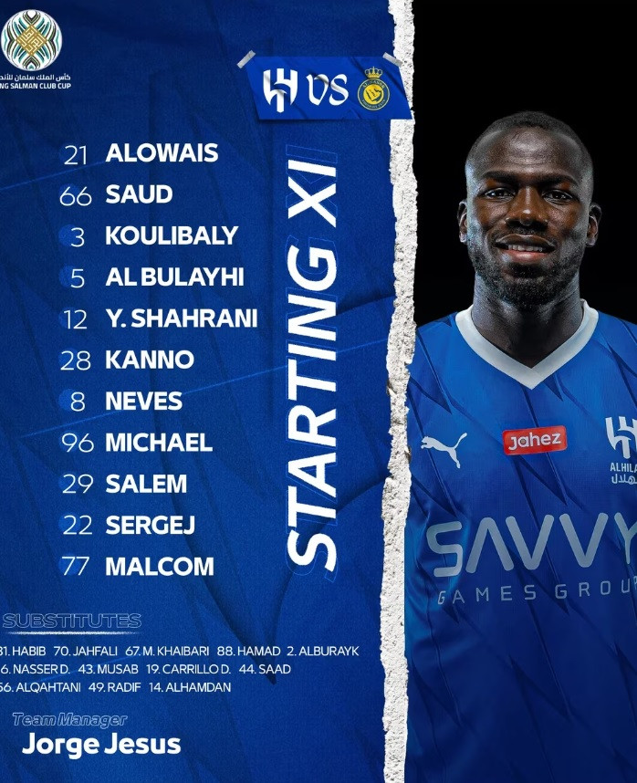 Al-Hilal: Al Owais, Al Shahrani (Al Burayk 83'), Al Boleahi, Koulibaly (Jahfali 83'), Abdullhamid, Al Dawsari, Neves (Radif 105'+1), Kanno (Al Juwayr 105'+2), Milinkovic-Savic, Michael (Al Hamdan 91'), Malcom (Carrillo 105'+1)