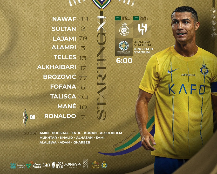 Al-Nassr: Al Aqidi, Al Ghanam, Al Oujami (Al Fatil 79'), Al Amri, Alex Telles, Brozovic (Al Sulaiheem 120'+2), Fofana, Al Khaibari (Konan 80'), Talisca (Ghareeb 91'), Mane (Al Aliwa 120'), Ronaldo (Al Hassan 115')