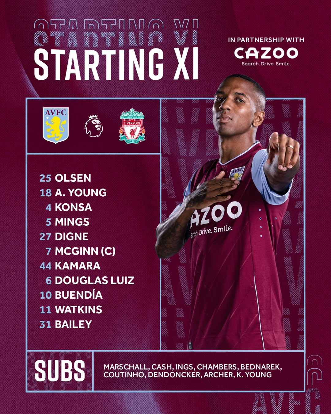 Aston Villa: Olsen; Young, Konsa, Mings, Digne; McGinn, Kamara (Coutinho 84'), Luiz; Buendia (Dendocker 85'), Watkins, Bailey (Ings 85').