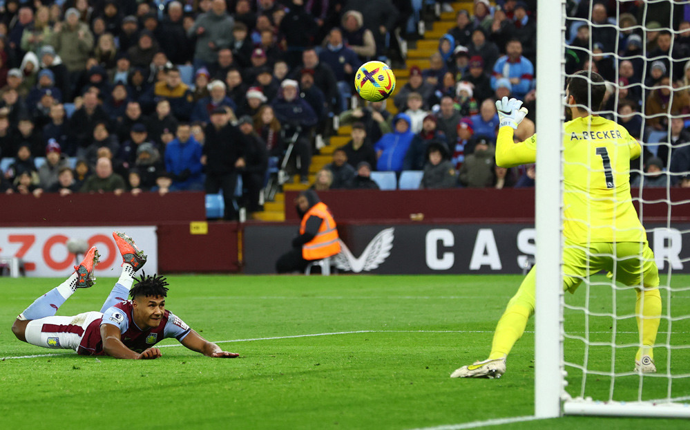 Đón đường chuyền vào từ cánh phải, Watkins lao vào đánh đầu đúng vào vị trí Alisson.