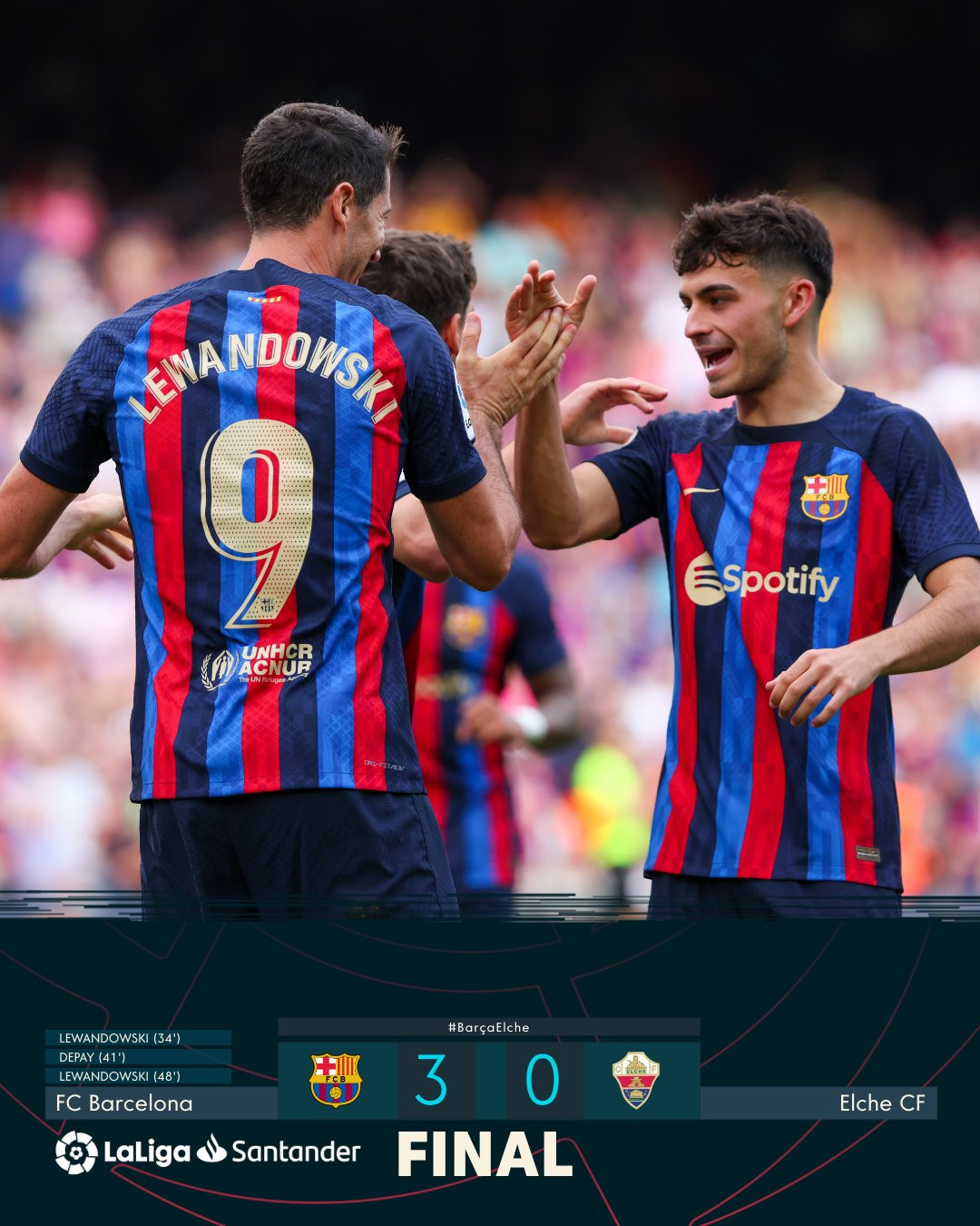 Với ưu thế hơn người, khi Verdu bị đuổi từ rất sớm, Barca áp đảo hoàn toàn và dẫn trước với các pha ghi bàn của Lewandowski và Memphis.