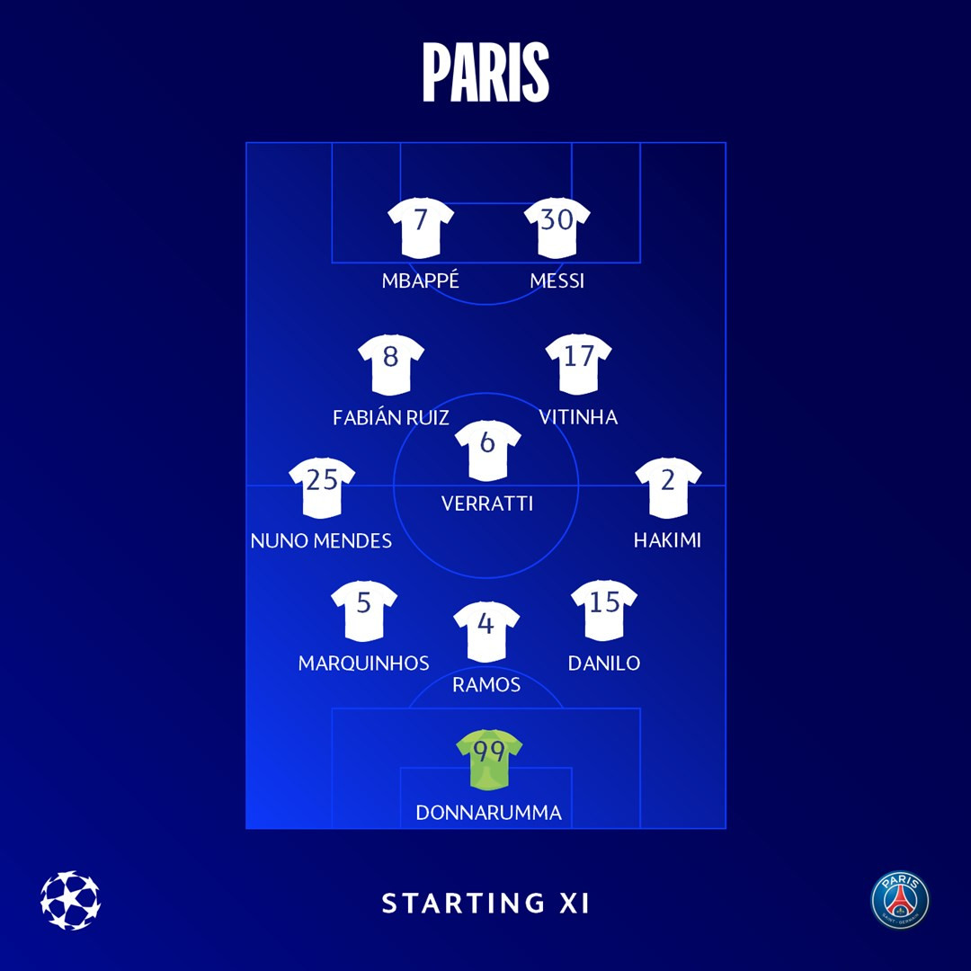 PSG: Donnarumma, Hakimi, Marquinhos (Mukiele 36', Bitshiabu 46'), Ramos, Danilo, Mendes (Juan Bernat 82'), Verratti, Vitinha (Hugo Ekitike 81'), Ruiz (Zaire Emery 76'), Messi, Mbappe.