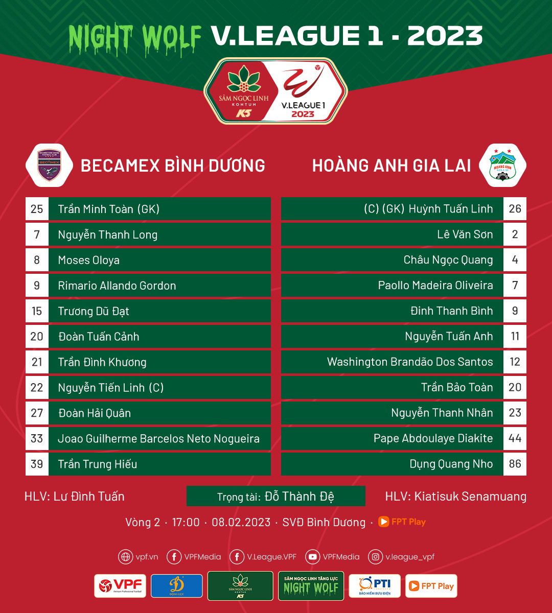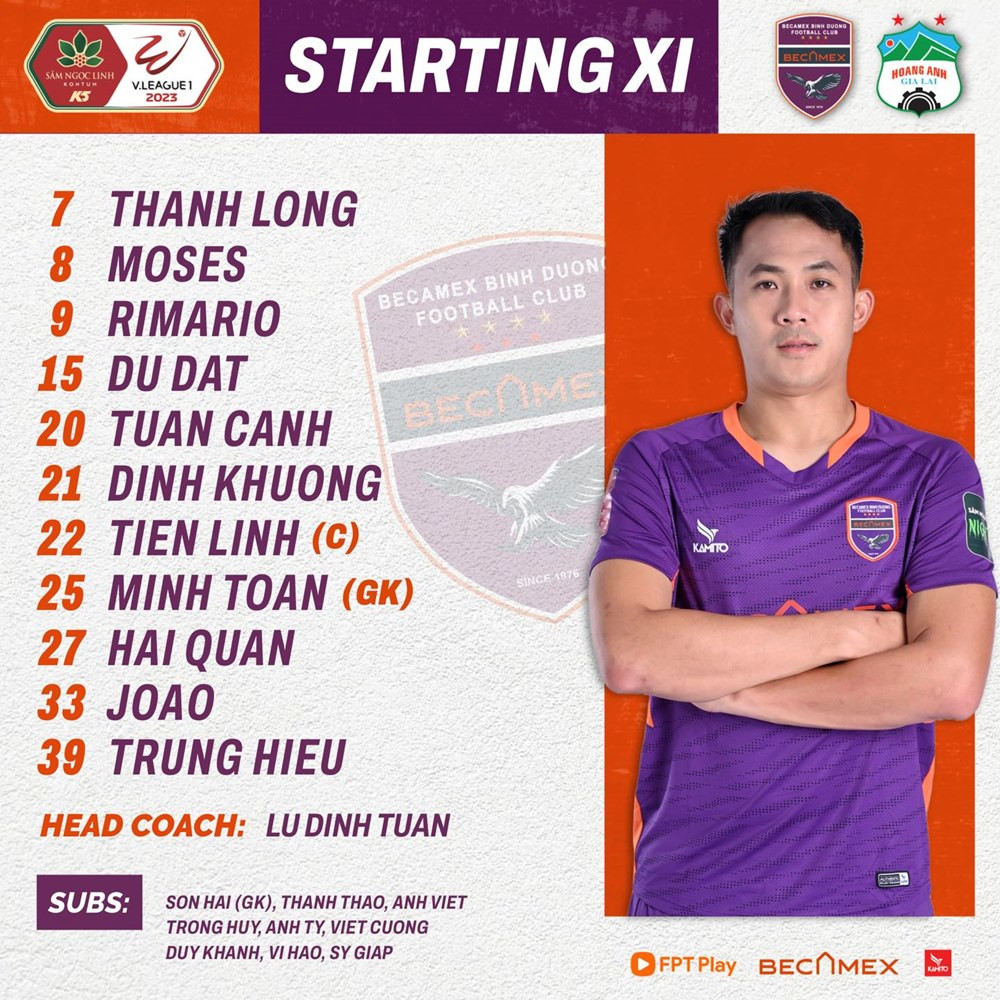 Bình Dương: Minh Toàn (25), Thanh Long (7), Dũ Đạt (15), Hải Quân (27), Tuấn Cảnh (20), Trung Hiếu (39), Đình Khương (21), Moses (8), Rimario (9), Tiến Linh (22), Joao Nogueira (33)
