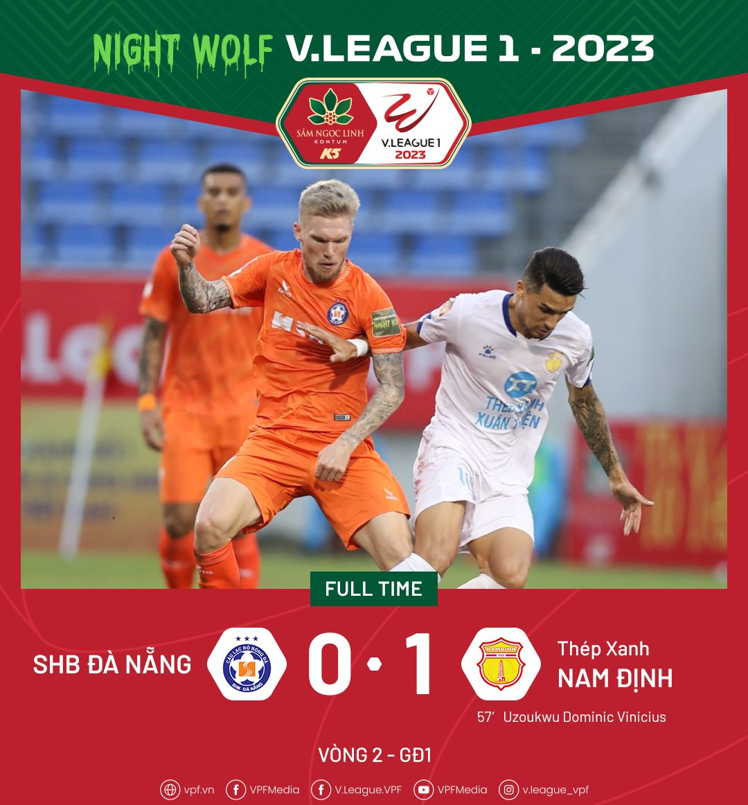 Trong khi đó, Thép Xanh Nam Định đánh bại SHB Đà Nẵng với tủ số 1-0 ngay trên sân Hòa Xuân.
