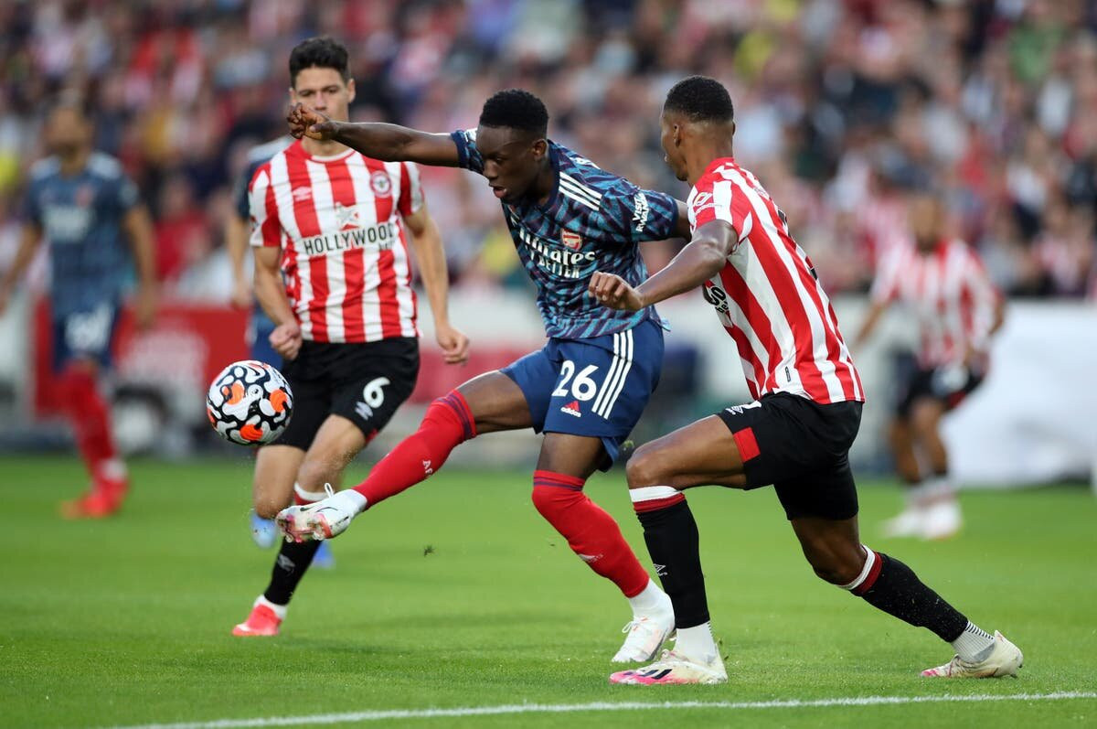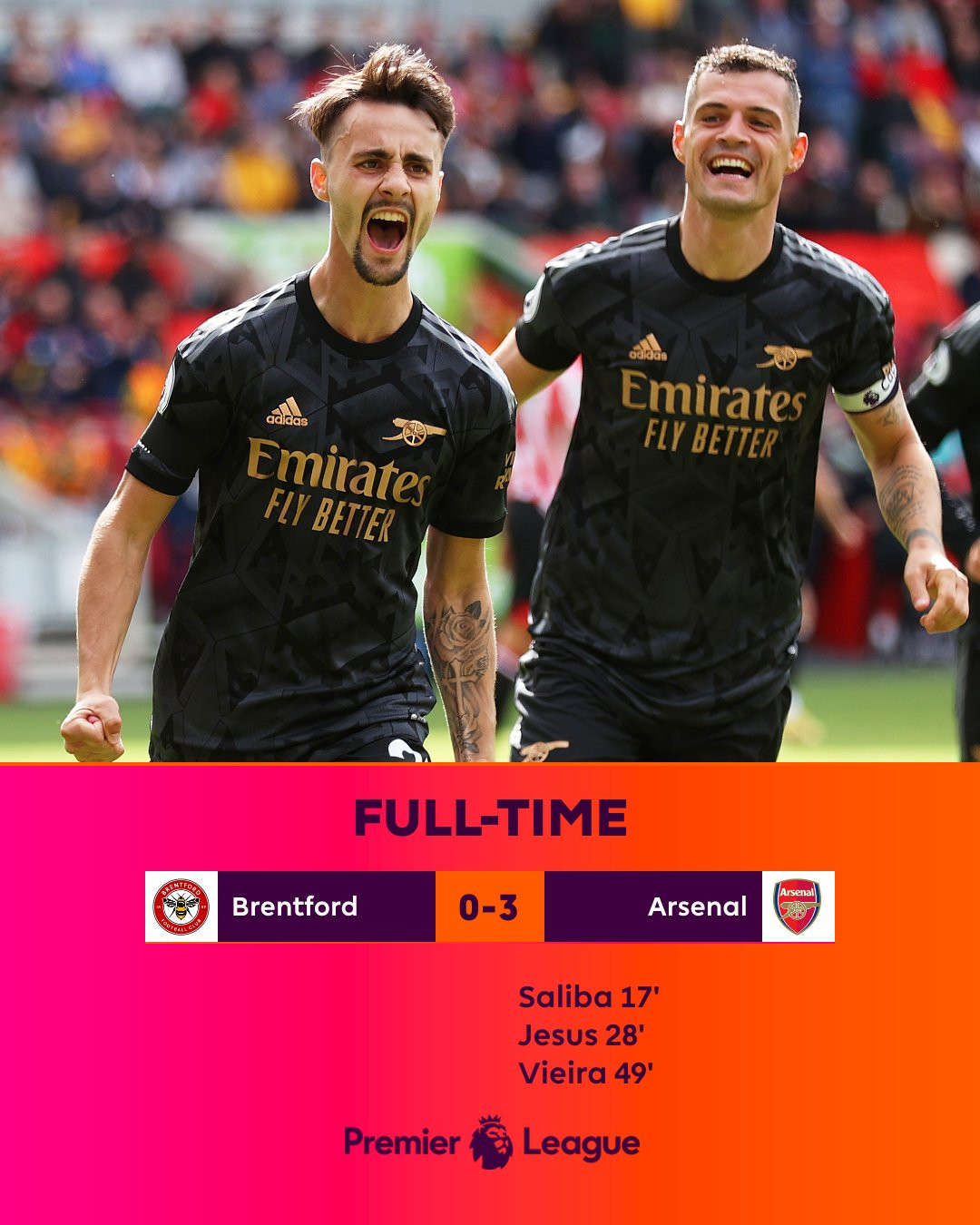 Bàn thắng (0-3, Fabio Vieira): Đón bóng từ Saka, nhận thấy khoảng trống trước mặt, Fabio Vieira nã đại bác sấm sét bằng chân trái, bóng dội cột dọc Brentford bay vào lưới.