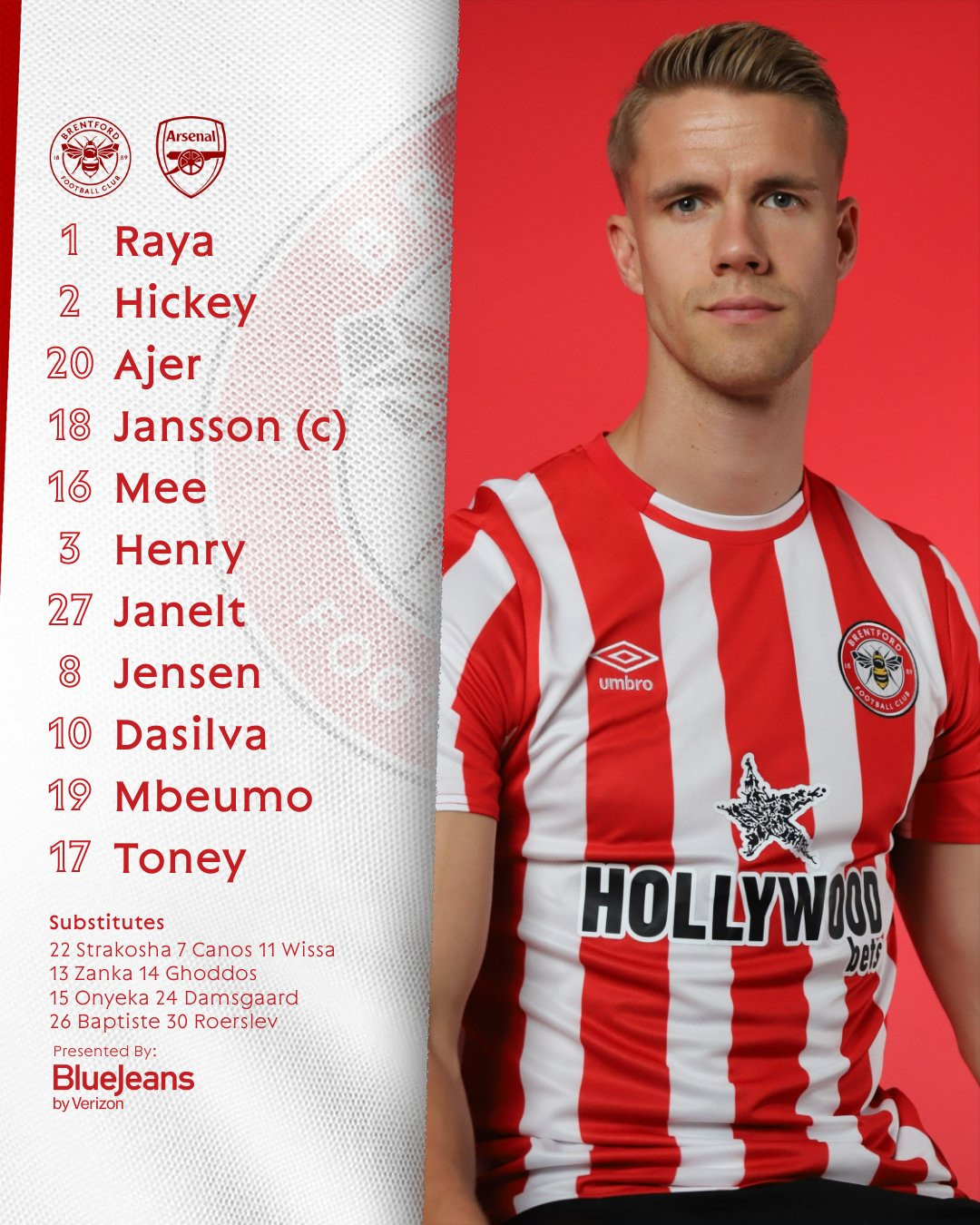Brentford: Raya; Hickey, Jansson, Mee, Ajer, Henry; Jensen, Janelt, Dasilva; Mbeumo, Toney.