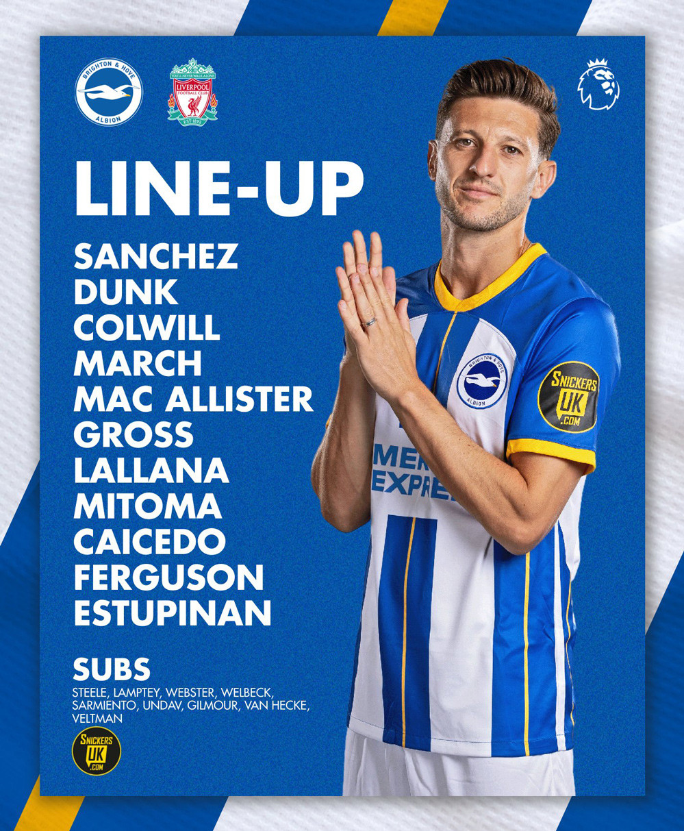 Brighton: Sanchez; March, Dunk, Colwill, Estupinan; Caicedo, Gross; McAllister, Lallana, Mitoma; Ferguson.