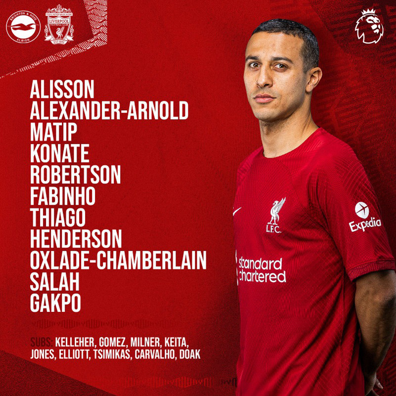 Liverpool: Alisson; Alexander-Arnold, Konate, Matip, Robertson; Thiago, Fabinho, Henderson; Salah, Oxlade-Chamberlain, Gakpo.