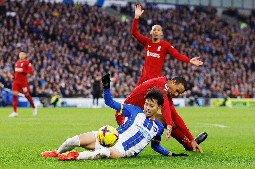 Mitoma liên tục khuấy đảo hàng thủ Liverpool. Ngôi sao người Nhật vừa lao lên bên cánh trái nhưng đường căng ngang vào lại hơi sâu.