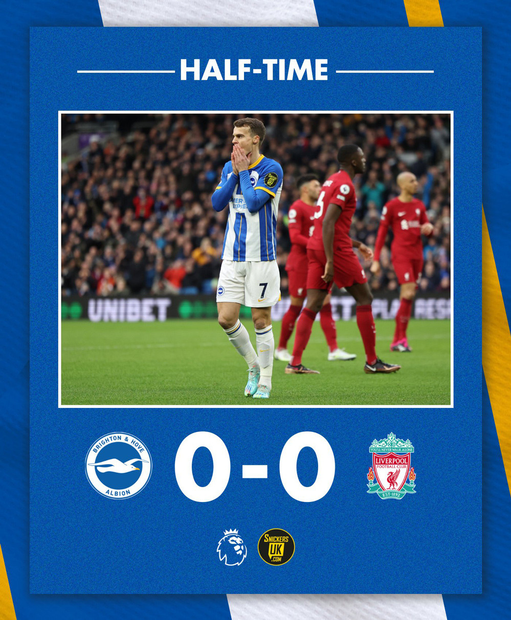Bàn thắng (1-0, Solly March): Tận dụng triệt để sai lầm của Matip, Mitoma kiến tạo dọn cỗ để March lao xuống kết thúc cận thành mở tỷ số cho Brighton.