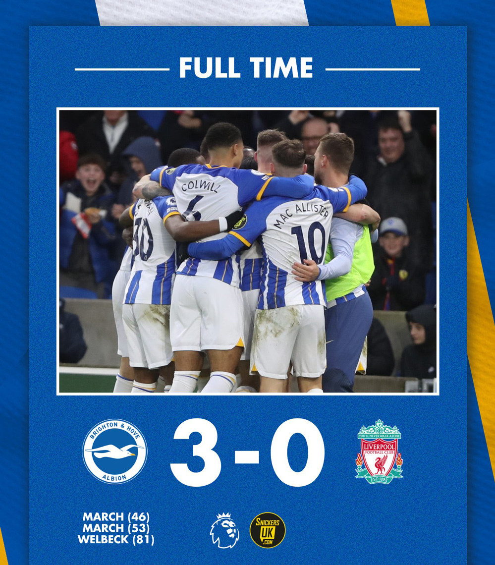 Bàn thắng (3-0, Danny Welbeck): Solly March đánh đầu chuyền cho Welbeck tâng bóng loại Gomez rồi volley cận thành tung lưới Liverpool.