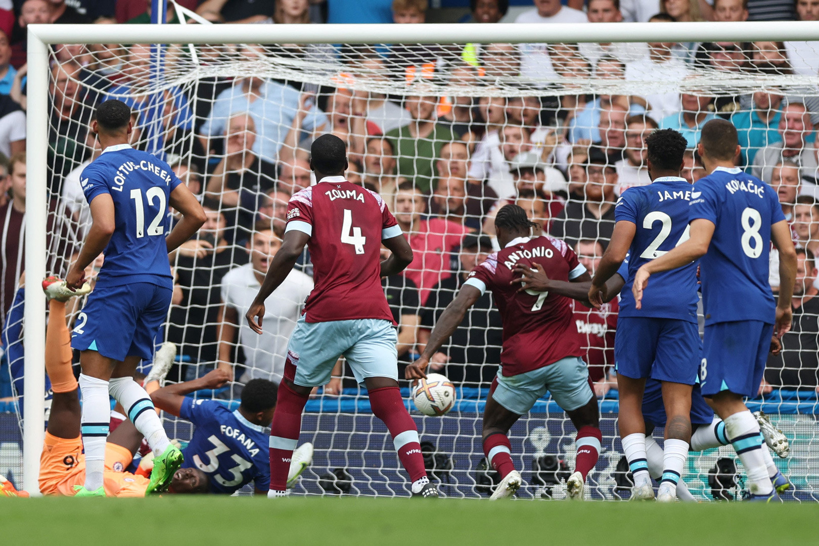 Bàn thắng! Chelsea 0-1 West Ham! Michail Antonio! Trong tình huống phạt góc, thủ môn Mendy nỗ lực phá bóng và ngã xuống sân, tình huống lộn xộn diễn ra và Antonio áp sát dứt điểm vào khung thành bỏ trống.