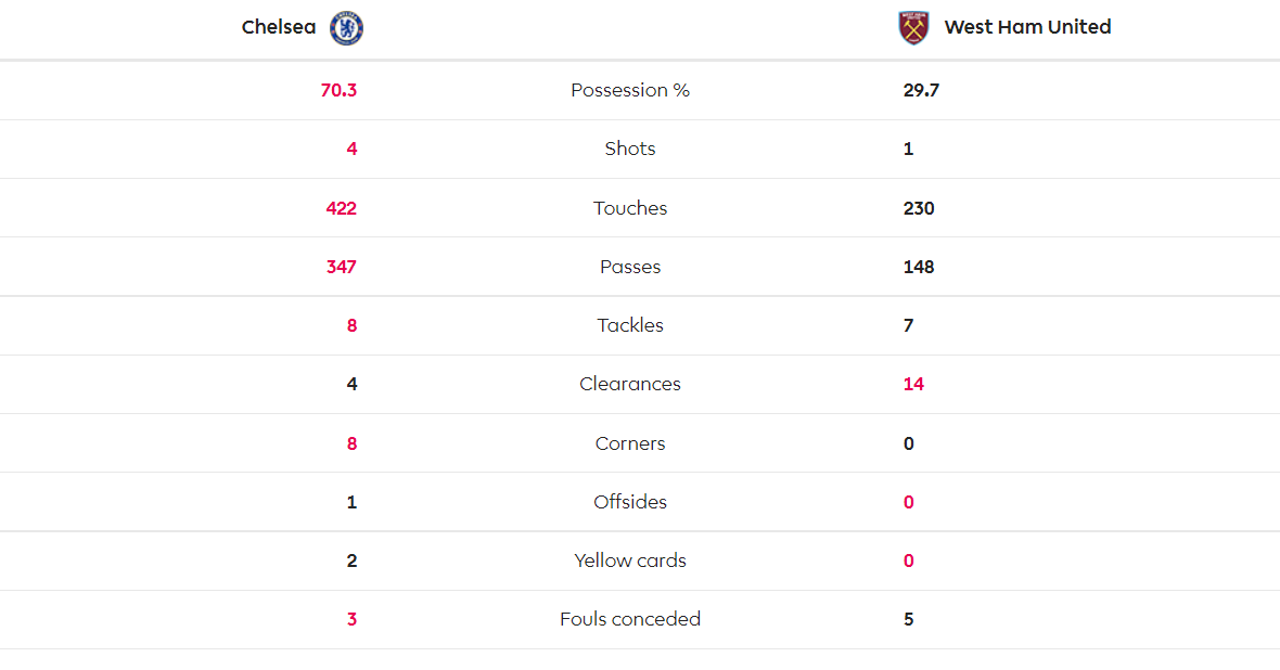 West Ham hầu như không thể lên bóng. Mặc dù vậy, Chelsea vẫn không thể áp đặt thế trận và tấn công bế tắc.