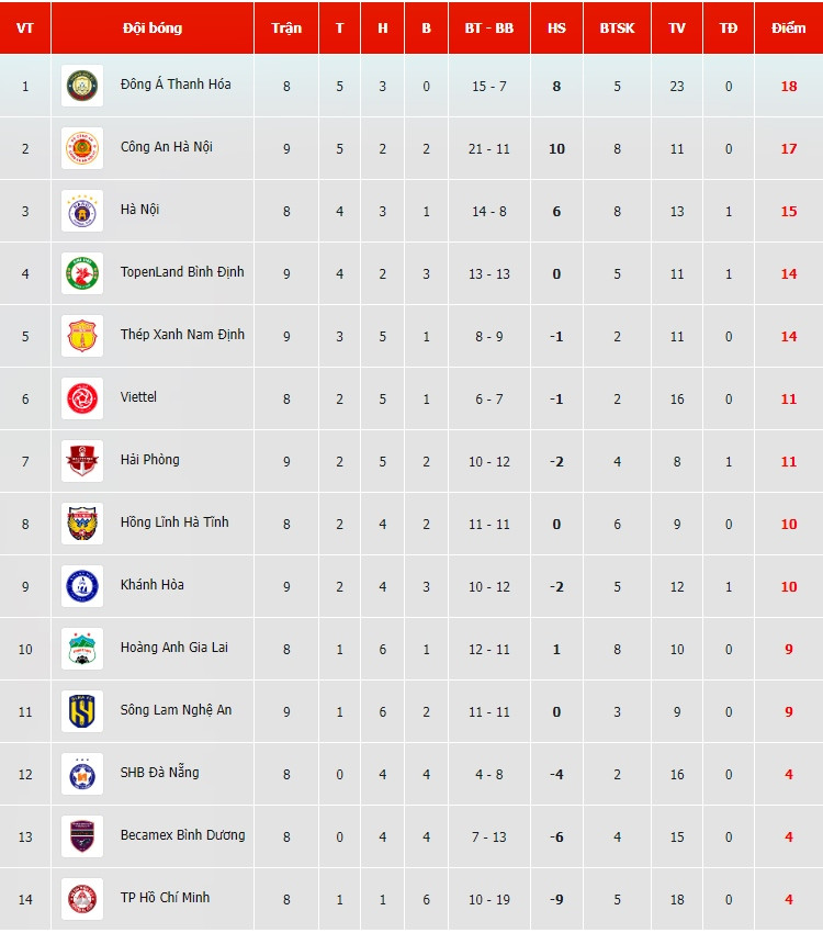 Bảng xếp hạng V-League 2023 vòng 8: Hà Nội kém Thanh Hóa 3 điểm