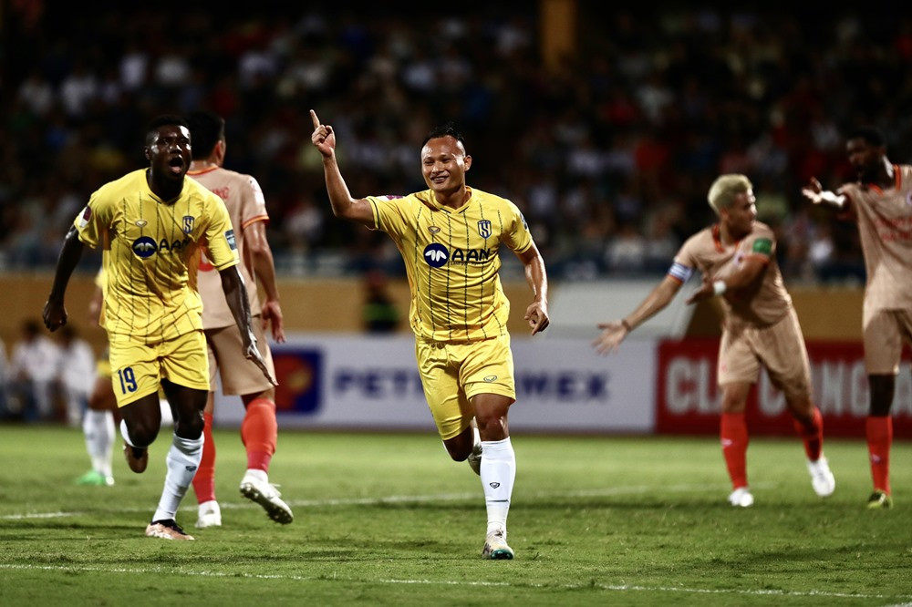 Từ cánh phải SLNA, Quế Ngọc Hải treo bóng vào vòng cấm CAHN để Trọng Hoàng băng vào đánh đầu tung lưới đội chủ nhà.