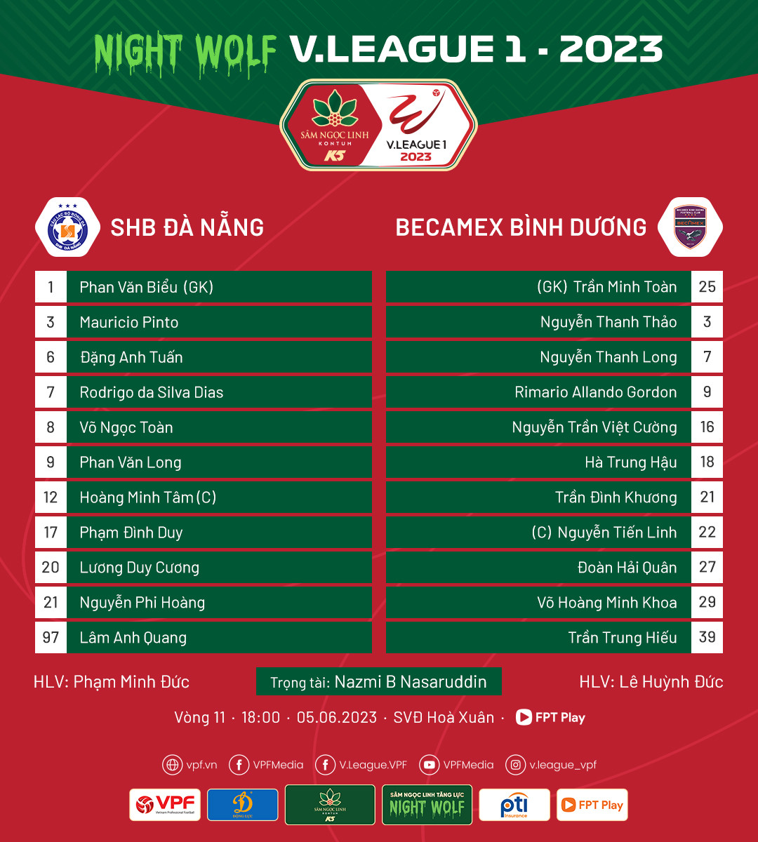 B.Bình Dương: Minh Toàn, Thanh Long, Trung Hậu, Thanh Thảo (Thanh Hoàng 46'), Đình Khương, Việt Cường, Hải Quân, Minh Khoa, Trung Hiếu, Rimario, Tiến Linh (Anh Tỷ 46')