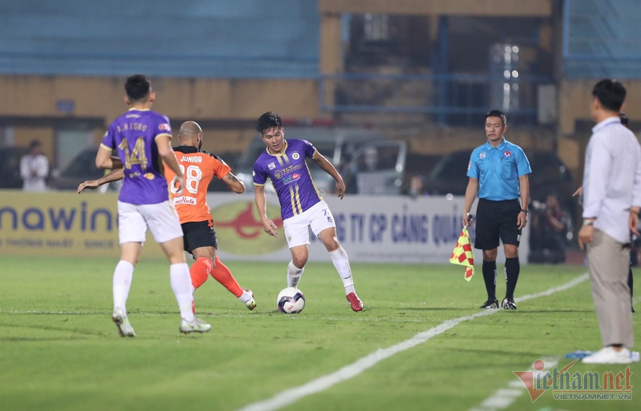 Đội trưởng Văn Quyết thực hiện cú sút phạt đẹp mắt từ ngoài vòng cấm, bóng đi vượt qua hàng rào và chỉ cách khung thành Đà Nẵng chỉ gang tấc.