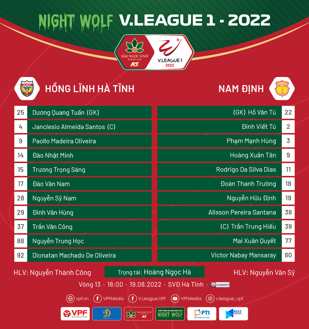 Nam Định: Văn Tú (thủ môn), Phạm Mạnh Hùng, Alisson, Trần Trung Hiếu, Hữu Định, Viết Tú, Xuân Quyết, Thanh Trường, Xuân Tân, Rodrigo, Mansaray.