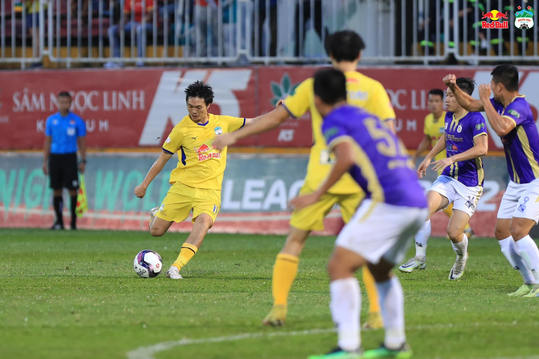 Văn Toàn tỉa khe tinh tế cho Brandao thoát xuống dứt điểm đưa bóng đi chệch khung thành Hà Nội FC.