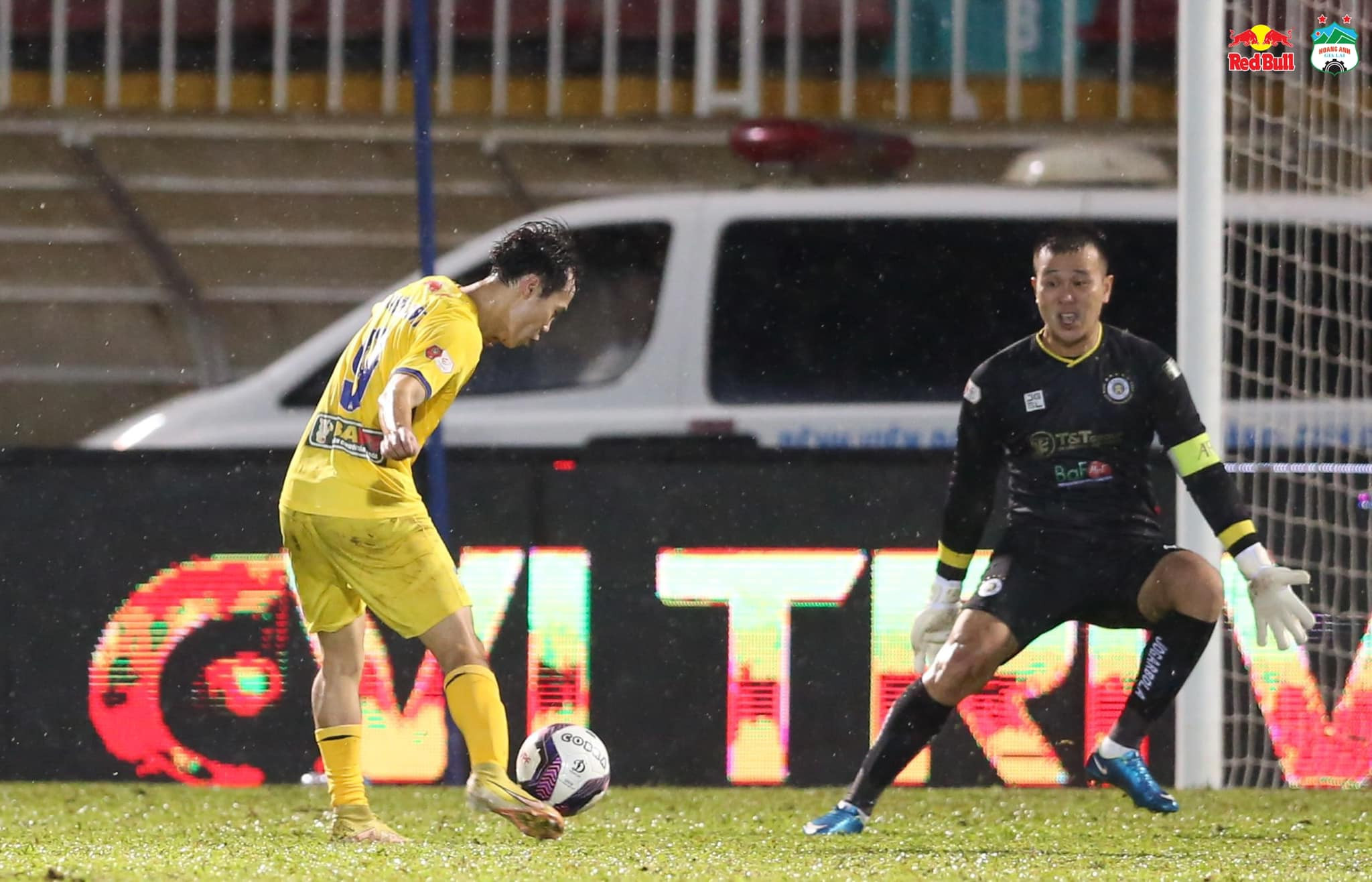 Cơ hội ngon ăn dành cho Văn Toàn nhưng tiền đạo quê Hải Dương lại dứt điểm đưa ra ngoài trong pha đối mặt với thủ môn Văn Công.