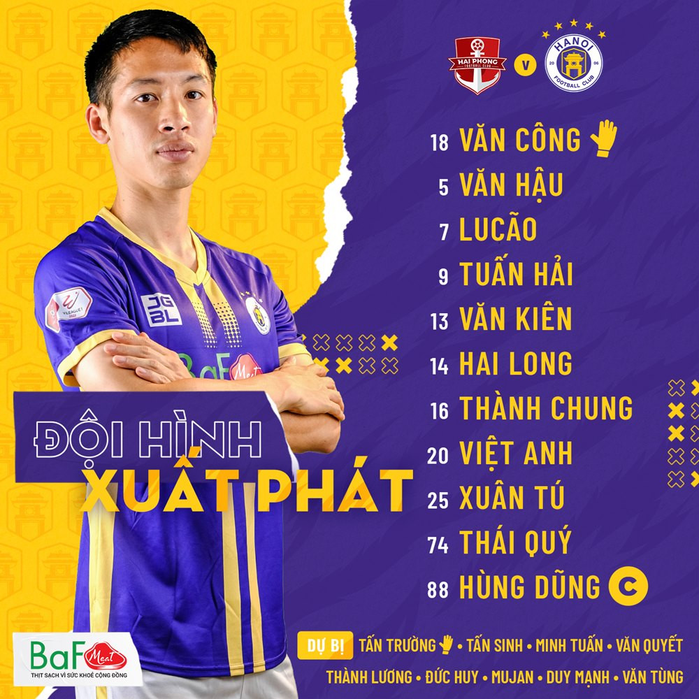 Hà Nội: Văn Công (thủ môn), Thái Quý (Văn Quyết 40'), Thành Chung (Duy Mạnh 46'), Việt Anh, Văn Hậu, Hai Long (Đức Huy 78'), Hùng Dũng (Vũ Minh Tuấn 78'), Văn Kiên, Xuân Tú (Thành Lương 63'), Lucao, Tuấn Hải.