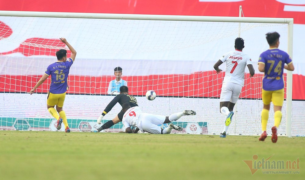 Mpande thoát xuống đối mặt với Văn Công nhưng cầu thủ của Hải Phòng không thắng được người gác đền của Hà Nội FC.
