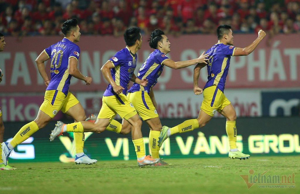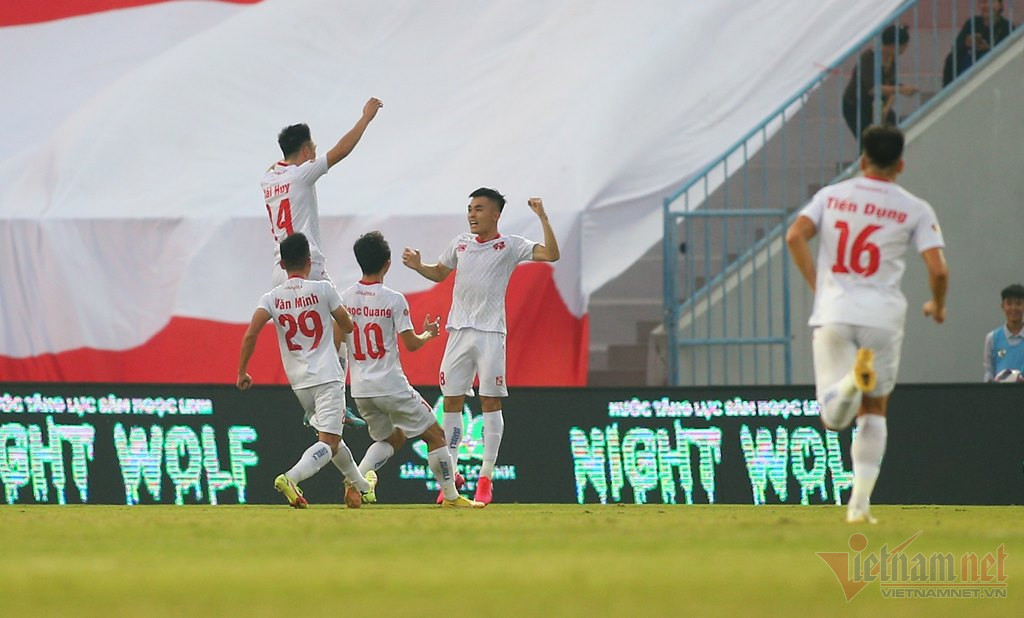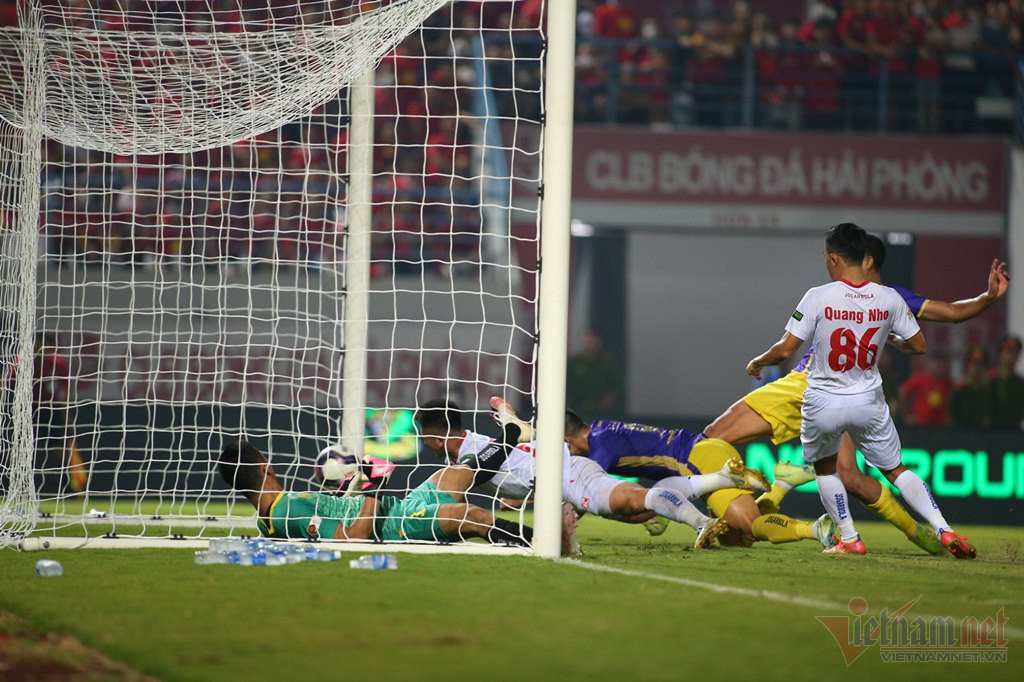 BÀN THẮNG! Hải Phòng 3-2 Hà Nội (Tuấn Hải): Thủ môn Đình Triệu lao ra đấm bóng, cú sút của cầu thủ Hà Nội tạo cơ hội để Việt Anh đánh đầu trong vòng cấm bị hậu vệ chủ nhà cản phá ngay trên vạch vôi. Tuấn Hải lao vào đánh đầu bồi cận thành rút ngắn tỉ số xuống còn 2-3 cho Hà Nội.