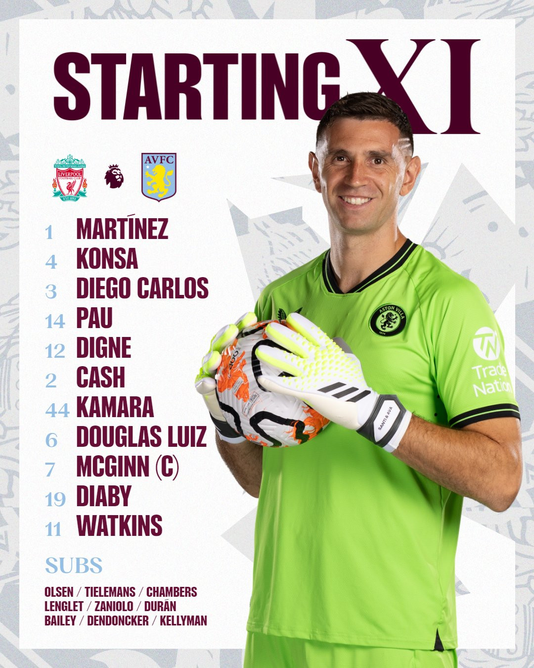 Aston Villa: Martinez; Cash, Konsa, Torres, Carlos, Digne; Kamara, Luiz; Diaby, McGinn; Watkins.