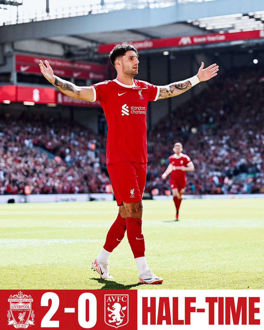Bàn thắng (1-0, Szoboszlai): Sau quả phạt góc bên cánh trái, Szoboszlai đón lõng ngoài vòng cấm rồi tung cú đá chân trái sấm sét tung lưới Aston Villa.