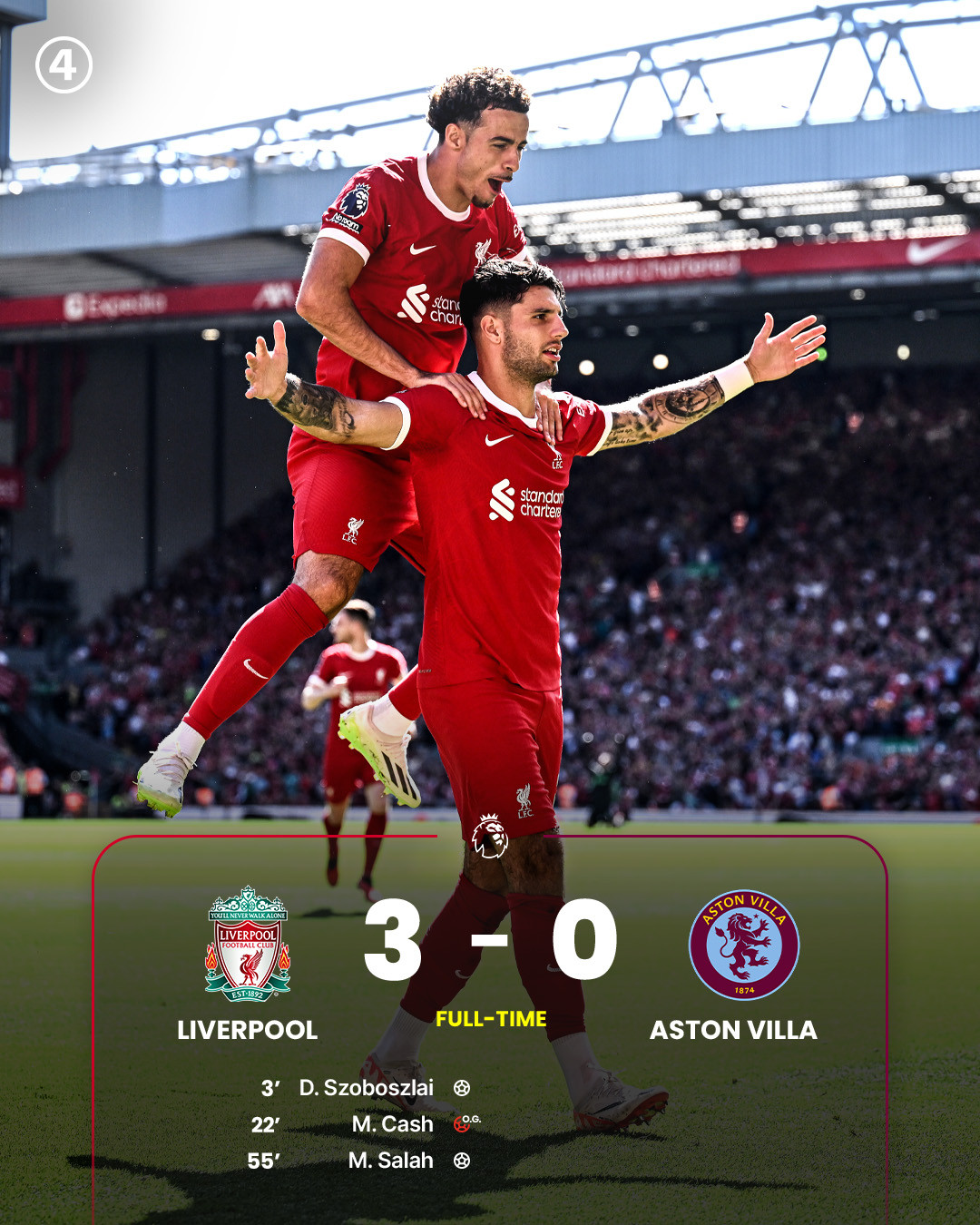 Bàn thắng: Szoboszlai 3', Cash 22' (phản lưới), Salah 55'