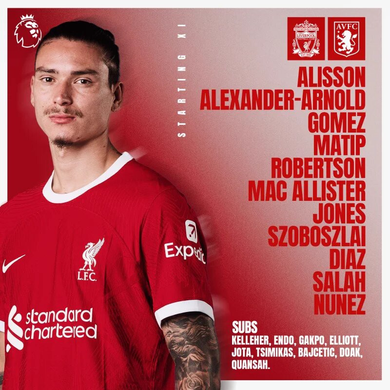 Liverpool: Alisson; Alexander-Arnold, Matip, Gomez, Robertson; Szoboszlai, Jones, Mac Allister; Salah, Nunez, Diaz.