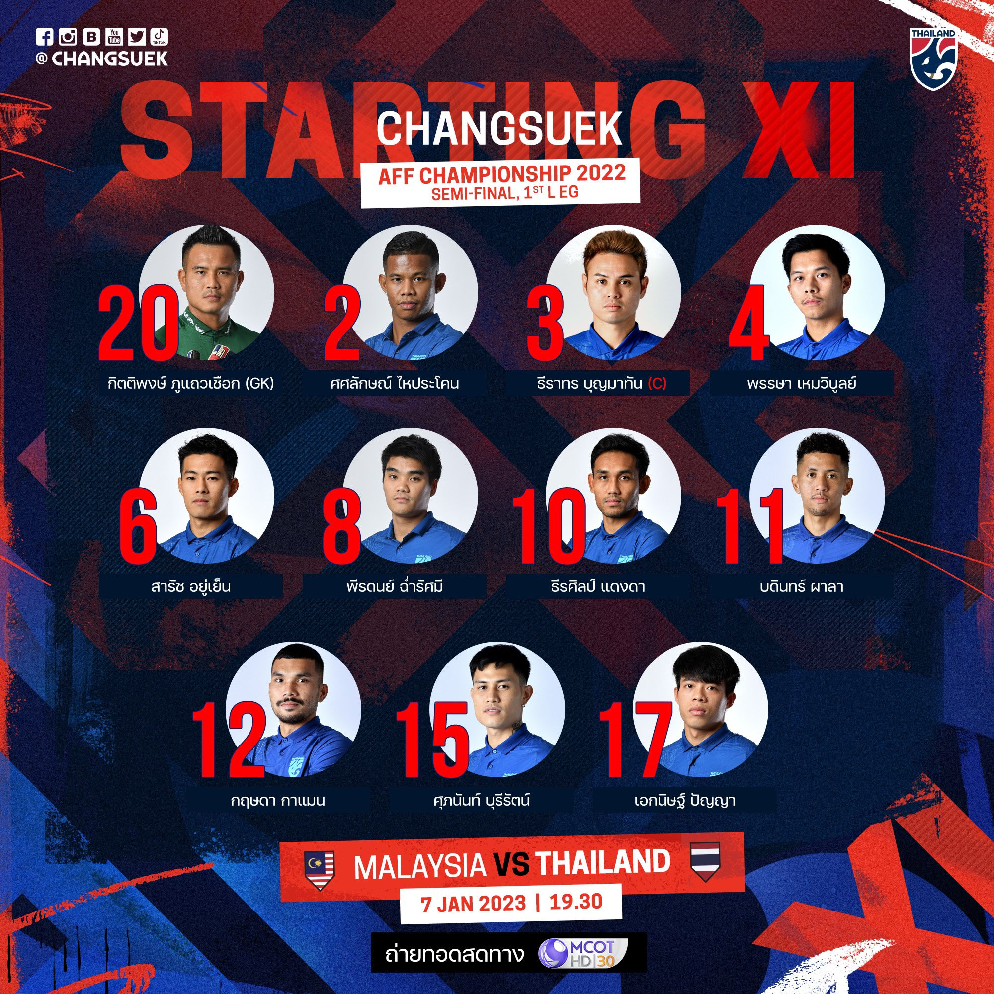 Thái Lan: Kittipong, Sasalak, Pansa, Suphanan, Kritsada, Sarach, Theerathon, Peeradol, Bordin Phala, Ekanit, Teerasil.