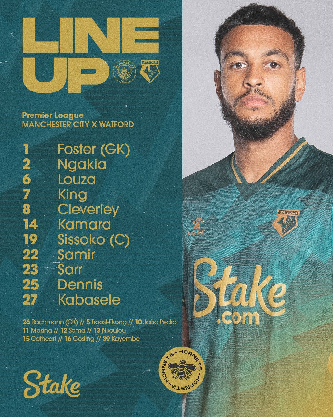 Watford (4-3-3): Foster, Ngakia, Kabasele, Samir, Kamara, Sissoko, Louza, Cleverley, Dennis, King, Sarr.