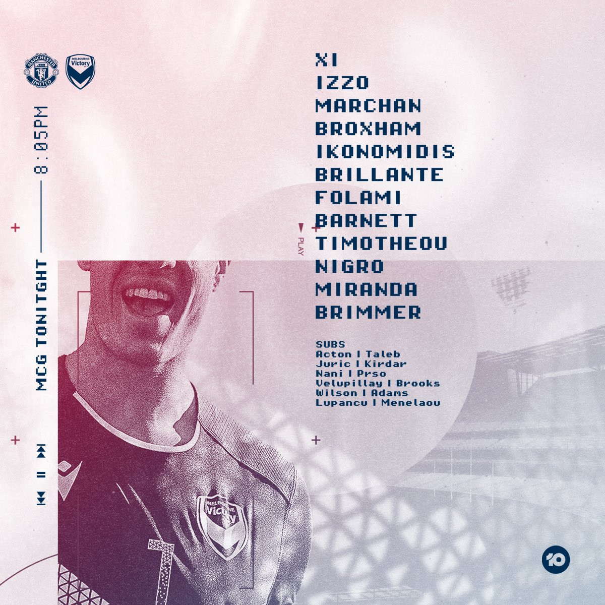 Melbourne Victory: Izzo, Marchan, Broxham, Ikonomidis, Brillante, Folami, Barnett, Timotheu, Nigro, Miranda, Brimmer.