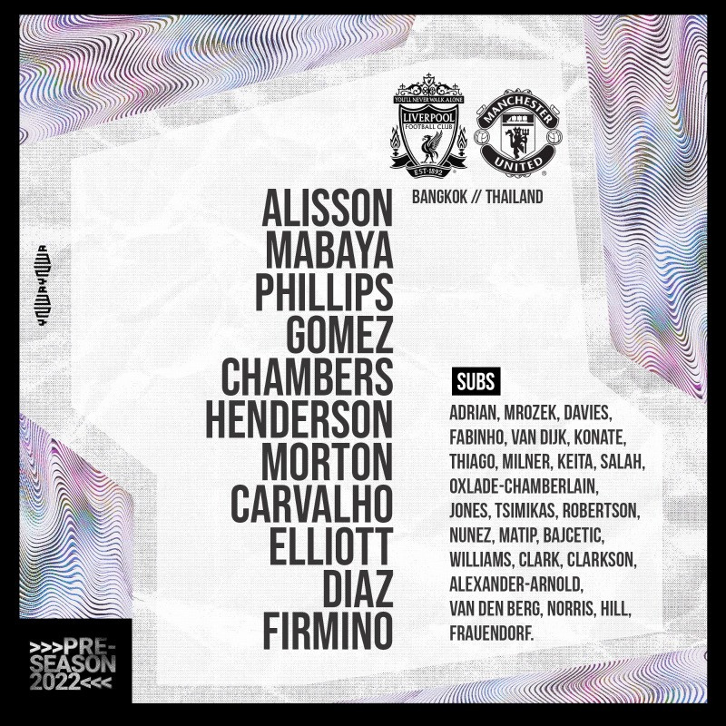 Liverpool: Alisson, Mabaya, Phillips, Gomez, Chambers, Elliott, Carvalho, Henderson, Díaz, Firmino, Morton.