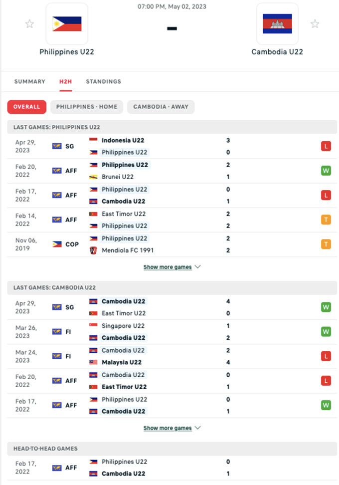 Đội hình xuất phát U22 Philippines vs U22 Campuchia