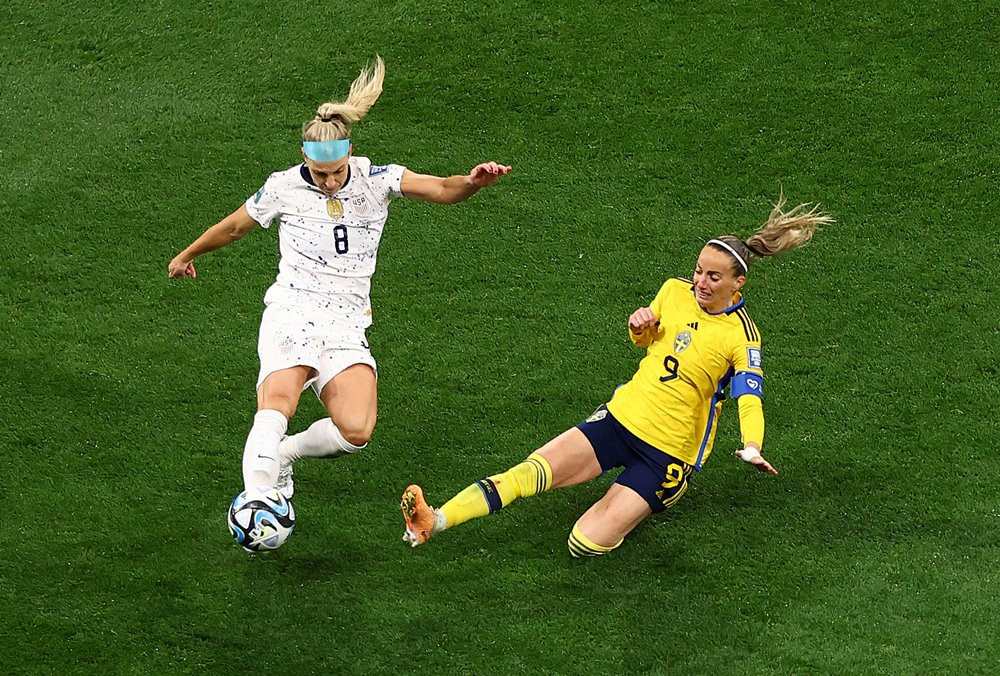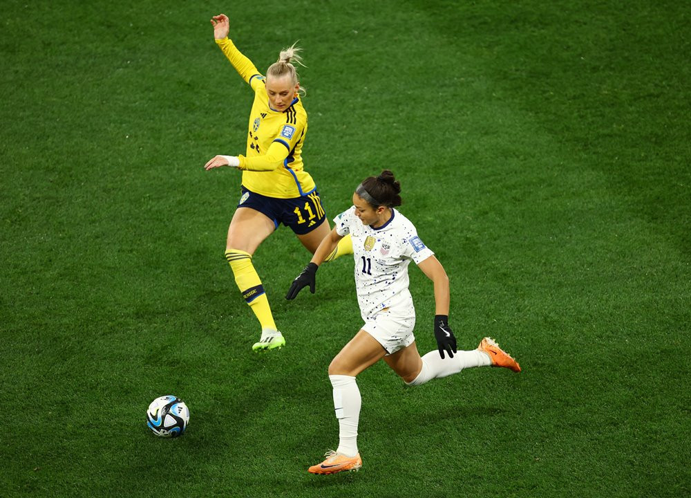 Tiền đạo kỳ cựu Alex Morgan xâm nhập vòng cấm rồi nỗ lực xoay người dứt điểm, tuy nhiên vẫn không thắng được thủ môn Thụy Điển.