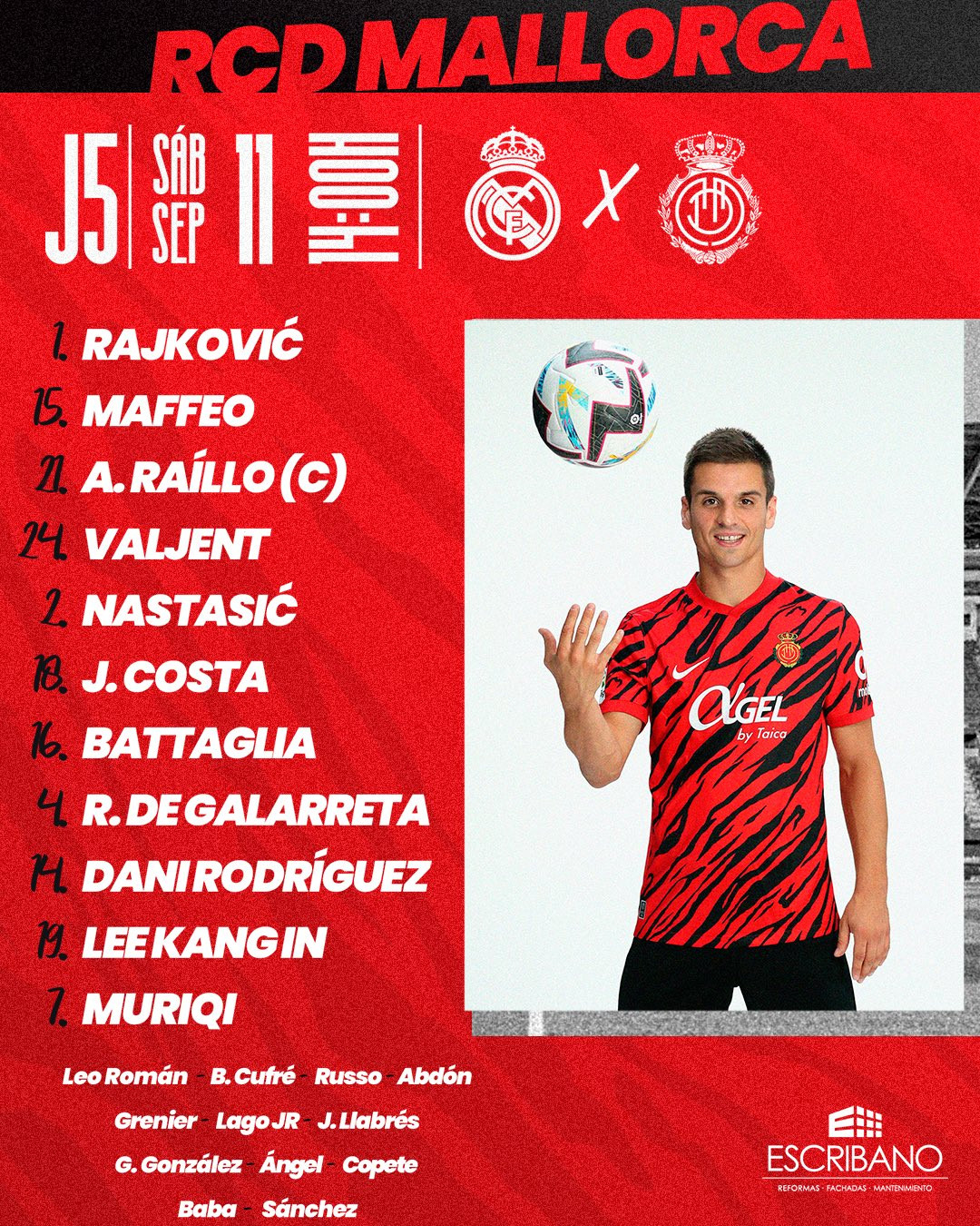 Mallorca (5-3-2): Rajkovic; Maffeo, Raillo, Valjent, Nastasic, Jaume Costa; De Galarreta, Battaglia, Dani Rodriguez; Lee Kang In, Muriqi.